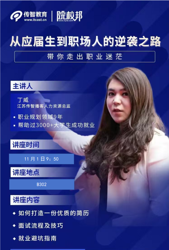 为了帮助即将踏入职场的应届毕业生更好地了解职场文化、做好职业规划,11月1日,计算机与人工智能学院邀请行业资深HR总监、江苏传智播客人力资源总监丁威女士为学生举办了一场主题为“从应届生到职场人的逆袭之路”的专题讲座,旨在通过专业人士的指导,帮助同学们掌握简历制作的技巧,了解求职过程中可能遇到的问题,并提供实用的解决方案。