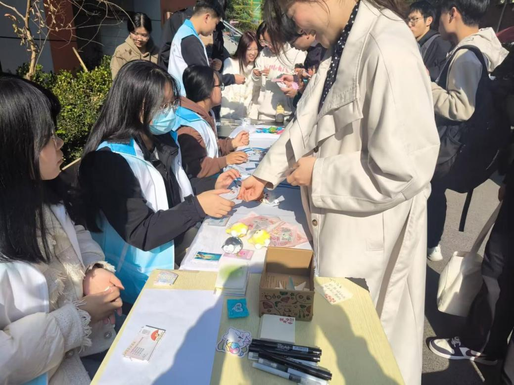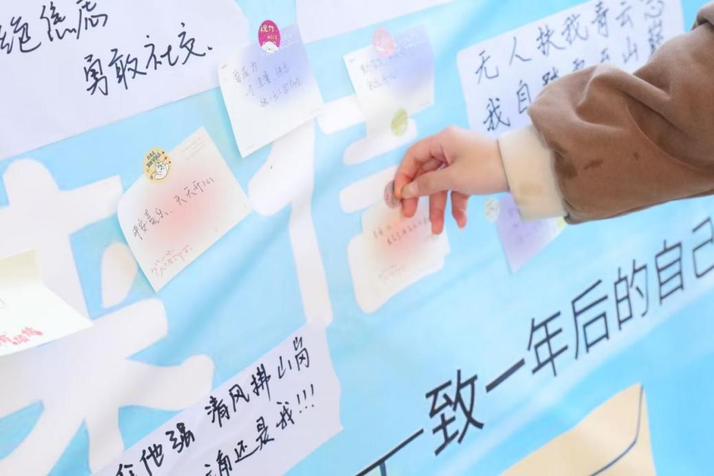 知识竞答注重以智慧心。正确回答题卡问题从而获得精美礼品,同学们热情参与,现场气氛热烈而欢快。暖心传递环节着重于以心暖心。同学们在便利贴上写下对自我或同窗的鼓励与祝福,将其粘贴于展板之上,让爱与温暖在指尖流淌,心心相融。知识积累环节着眼于以智识心。将心理小知识印于卡片之上送于学生,使学生进一步认识自我、理解自我、悦纳自我,更透彻理解心理健康的意义。