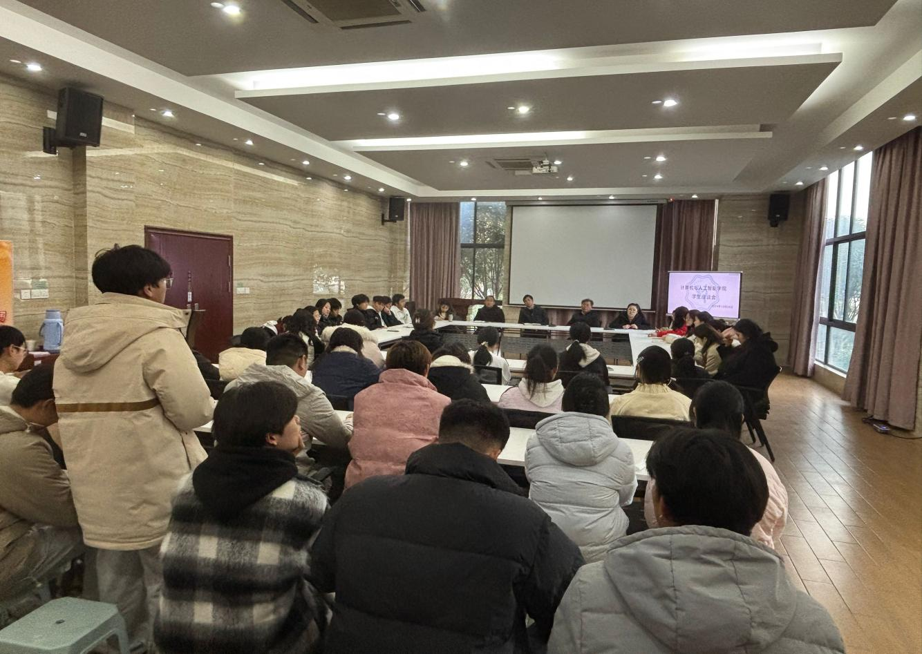 为了更好地了解同学们对学院教育教学、管理服务等方面的意见和建议,进一步增强我院教学管理和服务工作的针对性和实效性,12月25日下午,计算机与人工智能学院在郑蒲港校区1号会议室召开了学生干部座谈会。院长胡徐胜、党总支书记王平、党总支副书记韦晨珺娃、计算机教研室主任张利庭、教学秘书储弼淇、辅导员代表及郑蒲港校区各班级学生干部代表参加了会议。会议由韦晨珺娃主持。