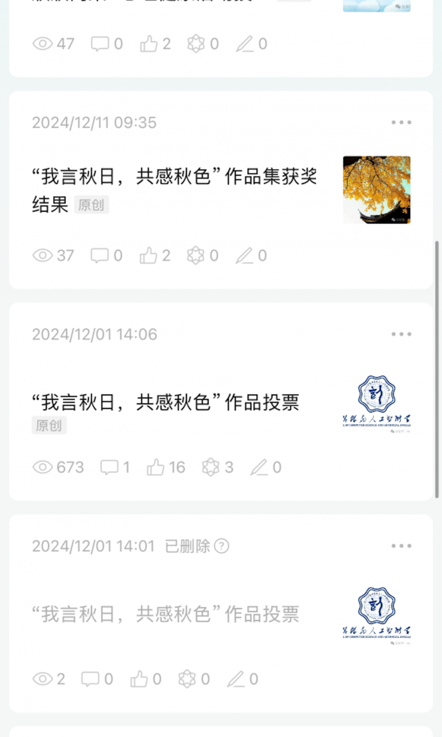 为深入领略与欣赏秋色之美,同时为广大摄影爱好学生搭建一个展示才华与创意的璀璨舞台,计算机与人工智能学院于11月12日至12月11日在学院团委微信公众号——皖工数智青春成功举办了第一届“我言秋日,共赏秋”作品投票活动。本次全程采用线上形式进行,极大地提升了参与的便捷性,选手们通过公众号后台私信即可投稿参赛。