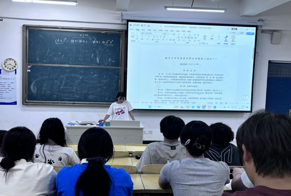 随后,辅导员带领新生学习了《学生日常行为规范》和《教室管理规定》,从课堂纪律、宿舍文明、网络言行、公共场所礼仪等方面提出明确要求,鼓励大家做到“知规范、守纪律、展风采、显担当”,共同营造良好的学习和生活氛围。