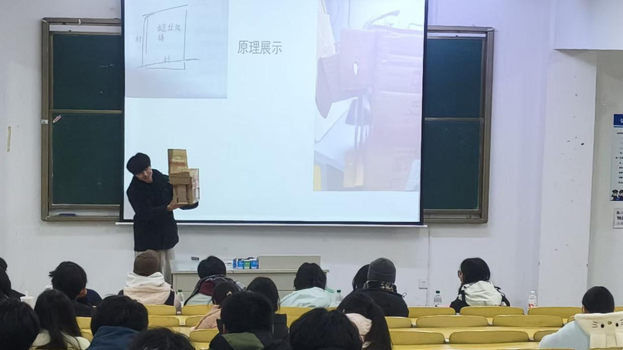 在A类作品展示环节,各参赛队伍依次登台,呈现了多元创意:既有AI赋能的校园节能系统,也有低碳主题的文创设计;既有贴近实际的绿色校园改造方案,也包含科技感十足的环保智能装置。选手们利用芬达瓶、泡沫、旧毛巾、纸箱等废旧材料,通过巧思重塑,赋予废品新的生命。通过生动详实的讲解,让在场观众感受到废品焕新的魅力,也体会到科技与艺术融合的温度。
