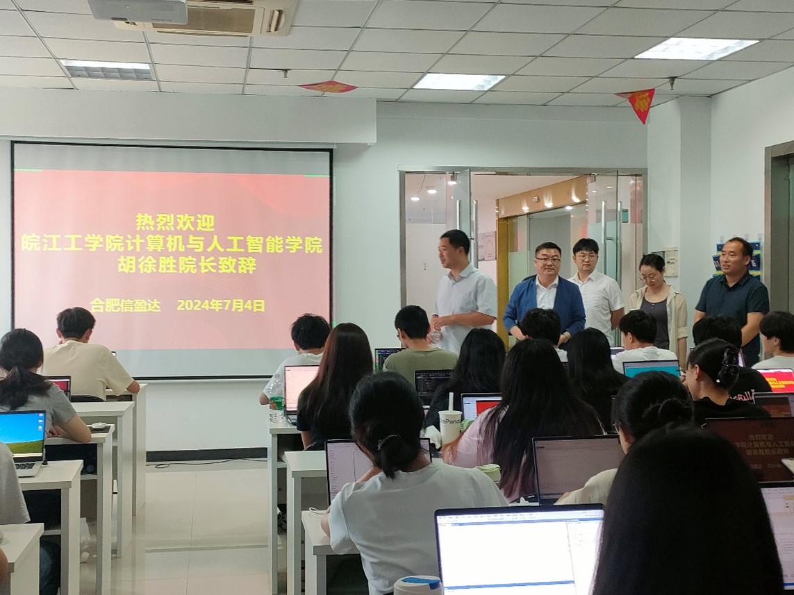 为深化校企合作、切实了解21级学生毕业实习情况,2024年7月4日,计算机与人工智能学院院长胡徐胜,计算机专业教研室主任张利庭、副主任王若贤,计算机基础教研室副主任韩静等一行,专程前往深圳信盈达科技有限公司合肥中心实地考察并看望正在开展毕业实习的学生。