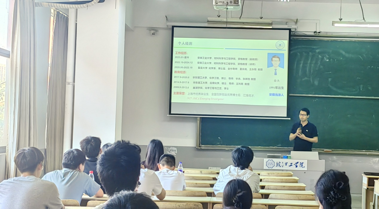 为深化学术交流、活跃科研氛围,2025年6月5日下午,机械工程学院特邀安徽工业大学材料科学与工程学院徐杰副教授(校聘教授)为师生们开展“有机功能材料在宽温域储能电池中的研究”专题讲座,此次活动由机械工程学院新能源教研室主任韩世昌主持。