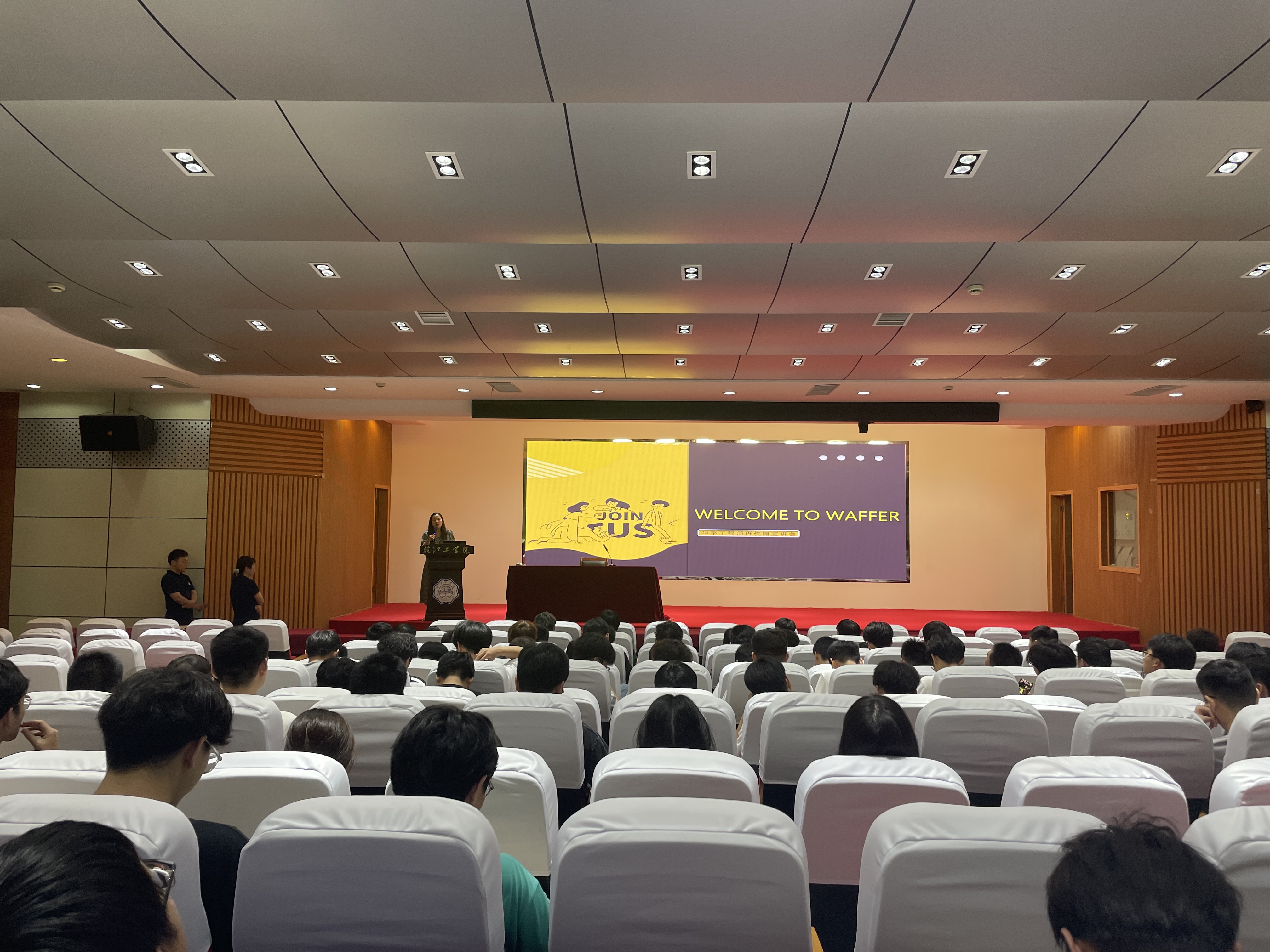 陶专员为参会同学介绍了企业的基本情况、目前高校毕业生的就业状况,鼓励同学们做好人生规划,选择适合自己的人生目标。陶专员详细介绍了工程师班的主要内容、相关政策和工程师班优势,从冠名、奖助、学制和其他支持几大方面介绍了华孚工程师班的运行模式。
