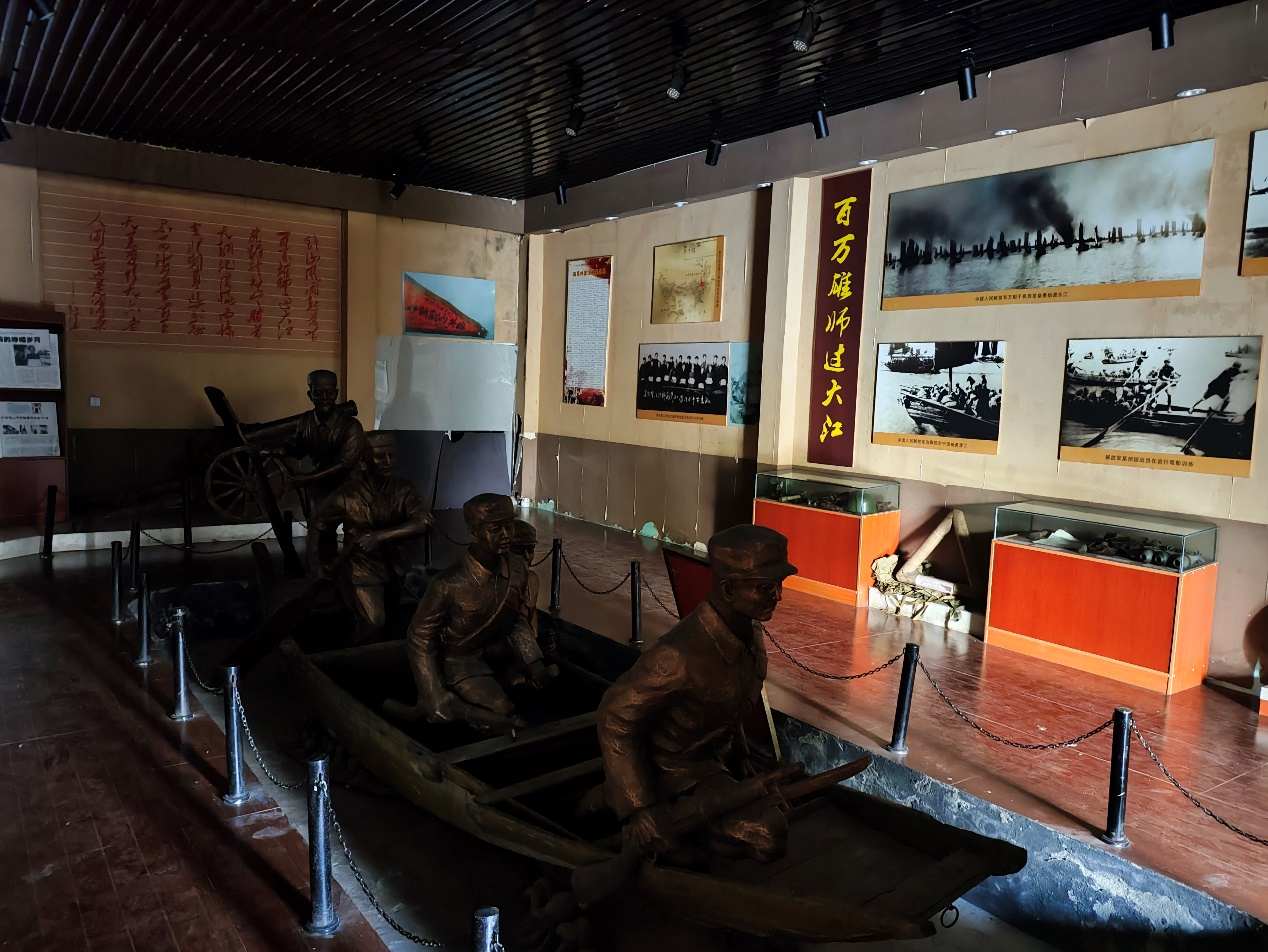 回民村依托纪念馆,持续开展4.21爱国主义教育活动,每次活动中,都会有大批中小学师生来到回民村,他们参观回民湾渡江战役遗址,听取现仍健在老船工讲述鲜活的渡江战役,在渡江历史纪念馆里感受红色历史缅怀革命先烈,开展爱国主义活动。渡江历史纪念馆的建成开发对于弘扬红色历史,彰显民族特色,促进民族团结,加深回汉两族人民的深厚情谊起到重要作用。”听罢我们怀着敬畏的心进入展厅。