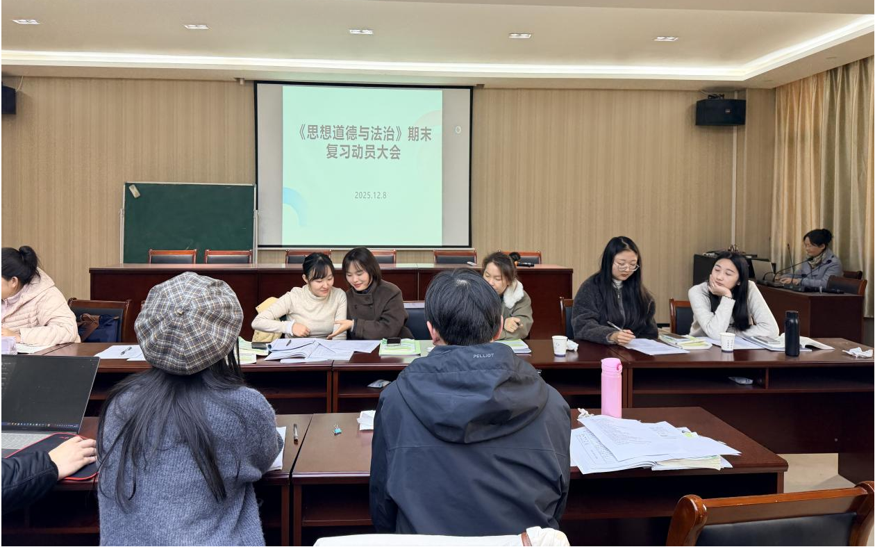 为系统梳理本学期教学脉络,精准部署期末复习工作,12月8日下午,思想道德与法治课程组在学院会议室召开期末复习动员大会。本次会议由马原与德法课教研室主任赵萍主持,全体任课教师参会。