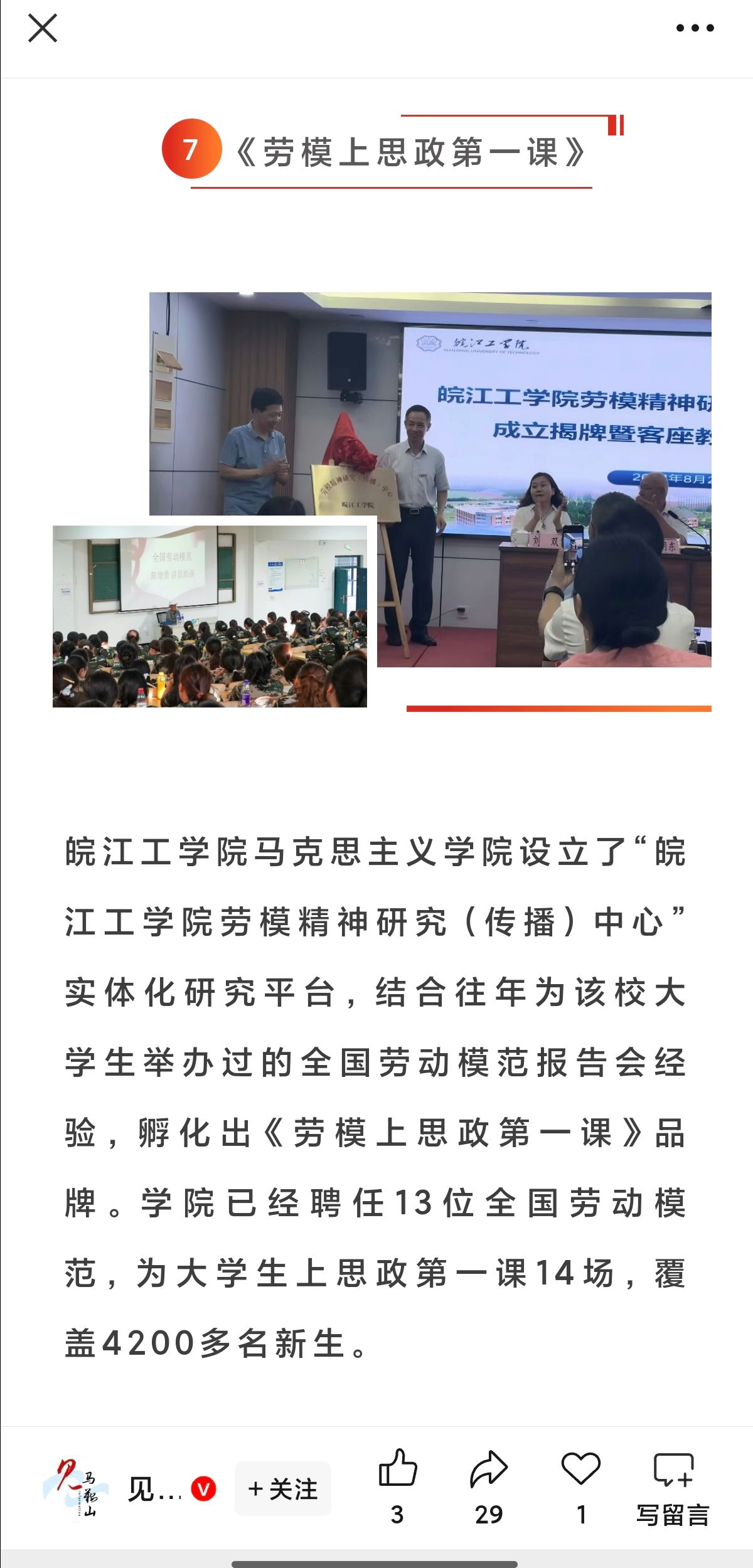 《见马鞍山》官方公众号报道beat365官网“劳模上思政第一课”列为首批思政教育特色品牌