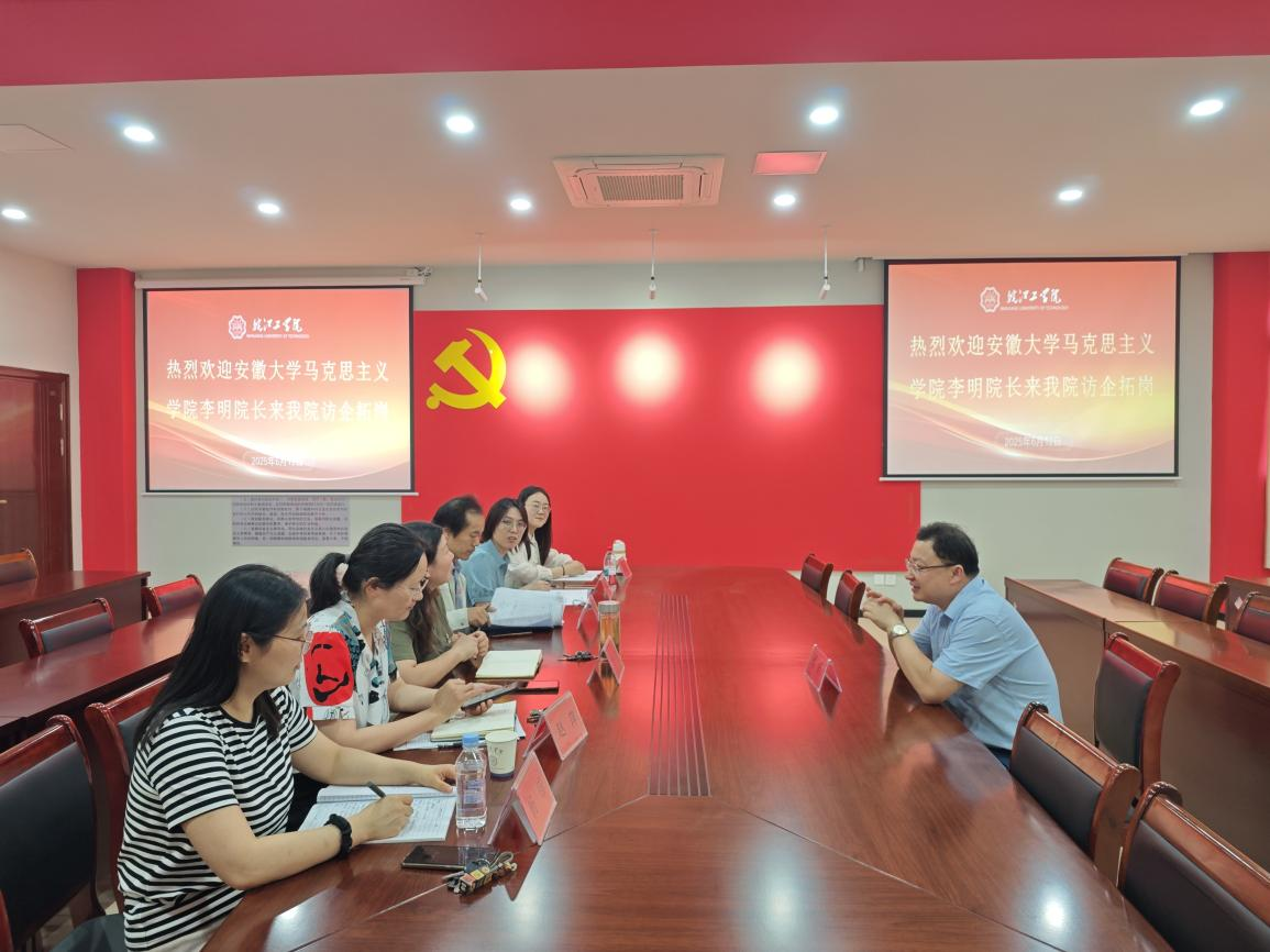 6月12日下午,安徽大学马克思主义学院与beat365官网马克思主义学院开展访企拓岗活动。安徽大学马克思主义学院院长李明,beat365正版唯一入口必一马克思主义学院常务副院长刘双,副院长胡耀东,党政办、教研室主任及教师代表参会。会议由刘双主持。