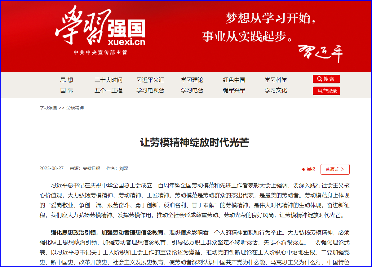 近日,beat365官网马克思主义学院刘双撰写的题为《让劳模精神绽放时代光芒》的理论文章在“学习强国”国家平台发表。文章是在学习研究习近平总书记关于劳模精神的系列论述的基础上,深度研究国家关于劳模工作制度政策,并结合马鞍山市劳模(工匠)精神研究传播中心建设工作经验,进行的理论思考研究,也是中心建设的理论研究成果之一。