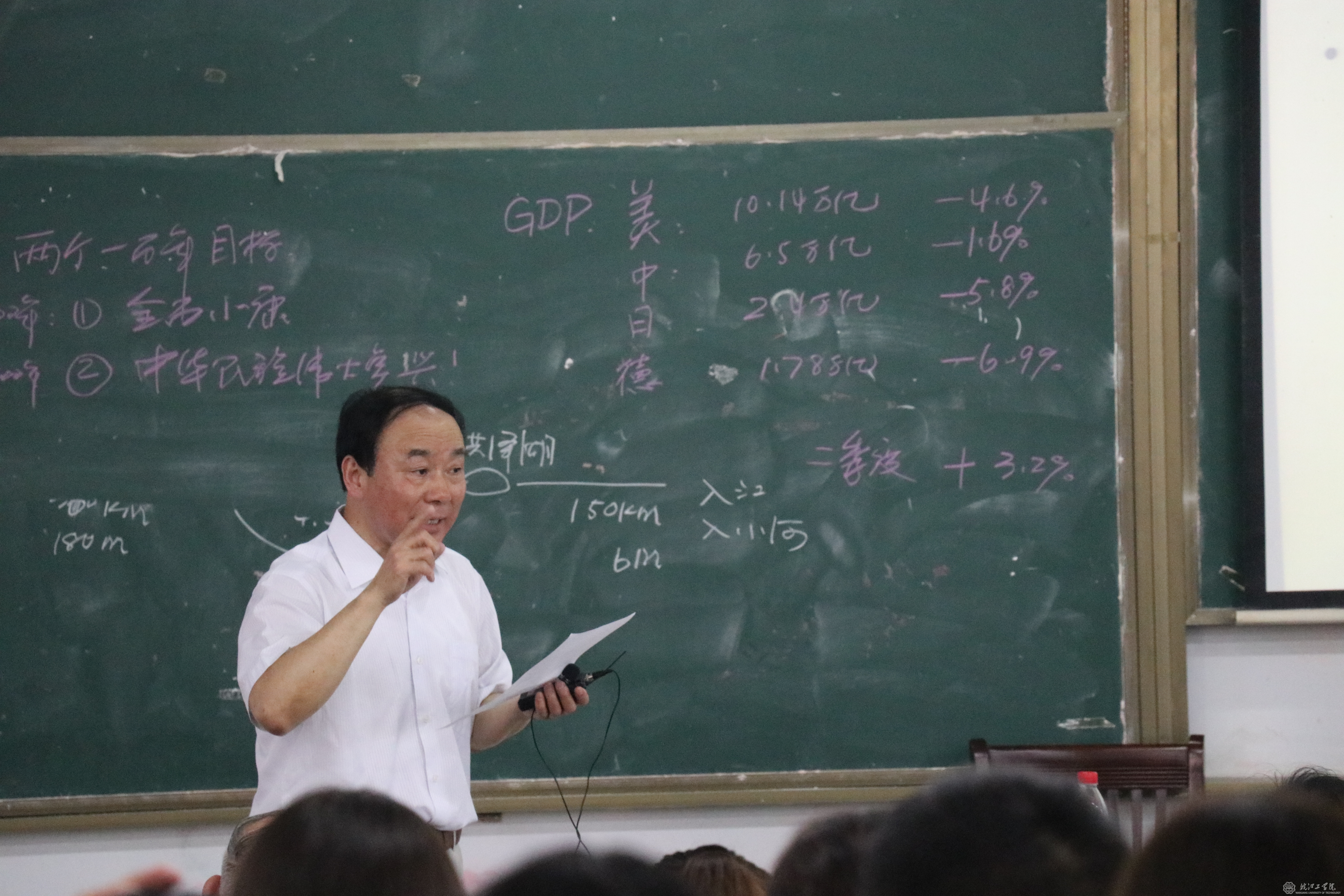 在我国当前经济形势部分,刘书记书写了2面板书,整理了大量数据、图表,令人震撼的数据,使全体听课师生切身体会到了祖国的强大离不开党的领导!