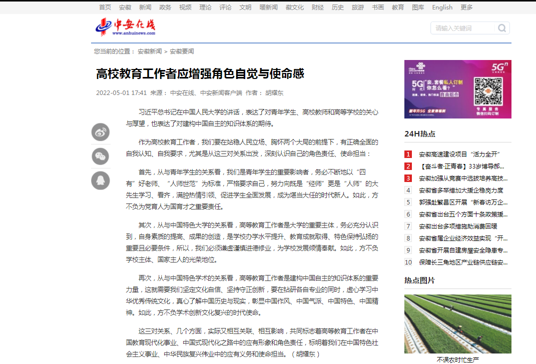 为深入学习贯彻习近平总书记在中国人民大学考察时重要讲话精神,近日,beat365官网副教授胡耀东代表马克思主义学院在学校学习会上发表言论,并以第一作者身份在《中安在线》媒体发表题为《高校教育工作者应增强角色自觉与使命感》的评论员文章,指引我们作为高校教育工作者,要在站稳人民立场、胸怀两个大局的前提下,有正确全面的自我认知、自我要求,应增强角色自觉与使命感。全文如下: