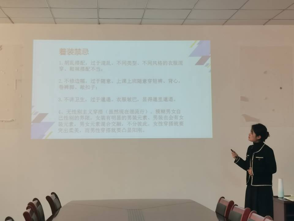 讲座中,她站在专业的视角并通过专业知识与大家分享教师礼仪规范知识。她从教师礼仪的内涵、重要性、基本要求及教师社交礼仪这四个方面展开讲解。她讲到,礼仪不仅成为一个国家、一个民族文明开化程度的重要标志,也成为国民素质高低的具体表现,而教师礼仪不是一般的礼貌,而是一种职业修养和职业素质,是在教育教学工作中必须掌握并娴熟运用的人际关系传播技能。她结合教师的职业特点,运用鲜活的案例、丰富的图片,从教师语言、教师服饰、教师形象、教师举止、教师情绪等专业角度进行了生动形象的讲解。同时又分别从男教师着装形象要求、女教师着装形象要求角度进行了讲述。整场讲座内容丰富,知识性和趣味性融合,互动性和活泼性统一。教师们纷纷表示收获颇多,对教师礼仪有了全新的认识,要学以致用,注意日常教师礼仪和行为,更好地展现新时代思政课教师形象。