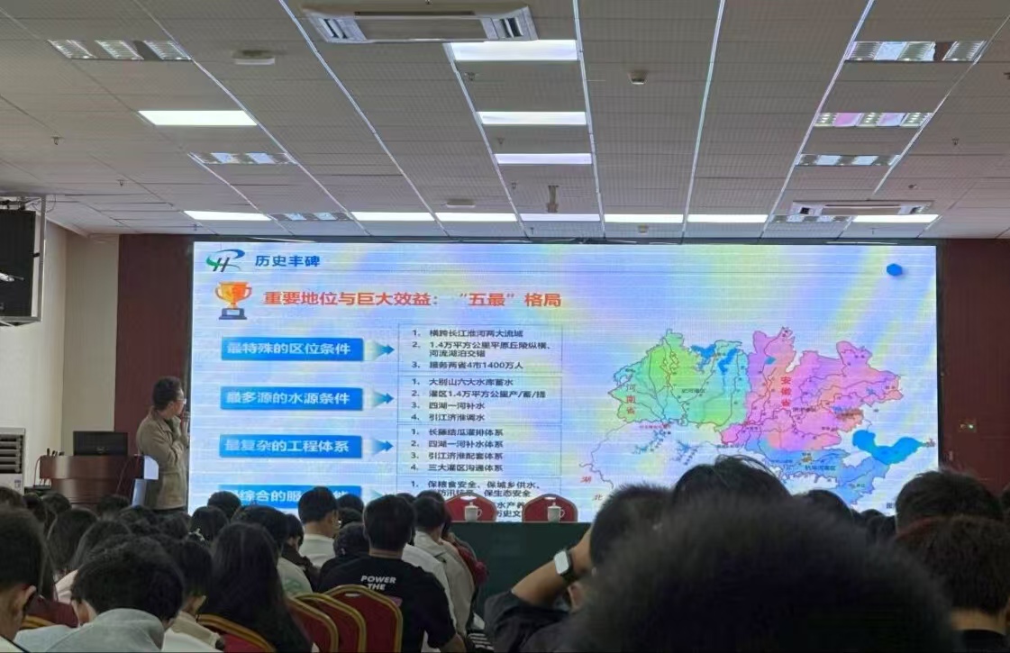 实习期间,淠史杭灌区管理总局贺亚斌副处长与安徽省水利厅专家张玉田分别带来《灌区规划与实践报告》和《淠史杭灌区标准化管理工作报告》。丰富的实例与图片展示,让同学们对灌区全貌有了更深入的理解,收获颇丰。