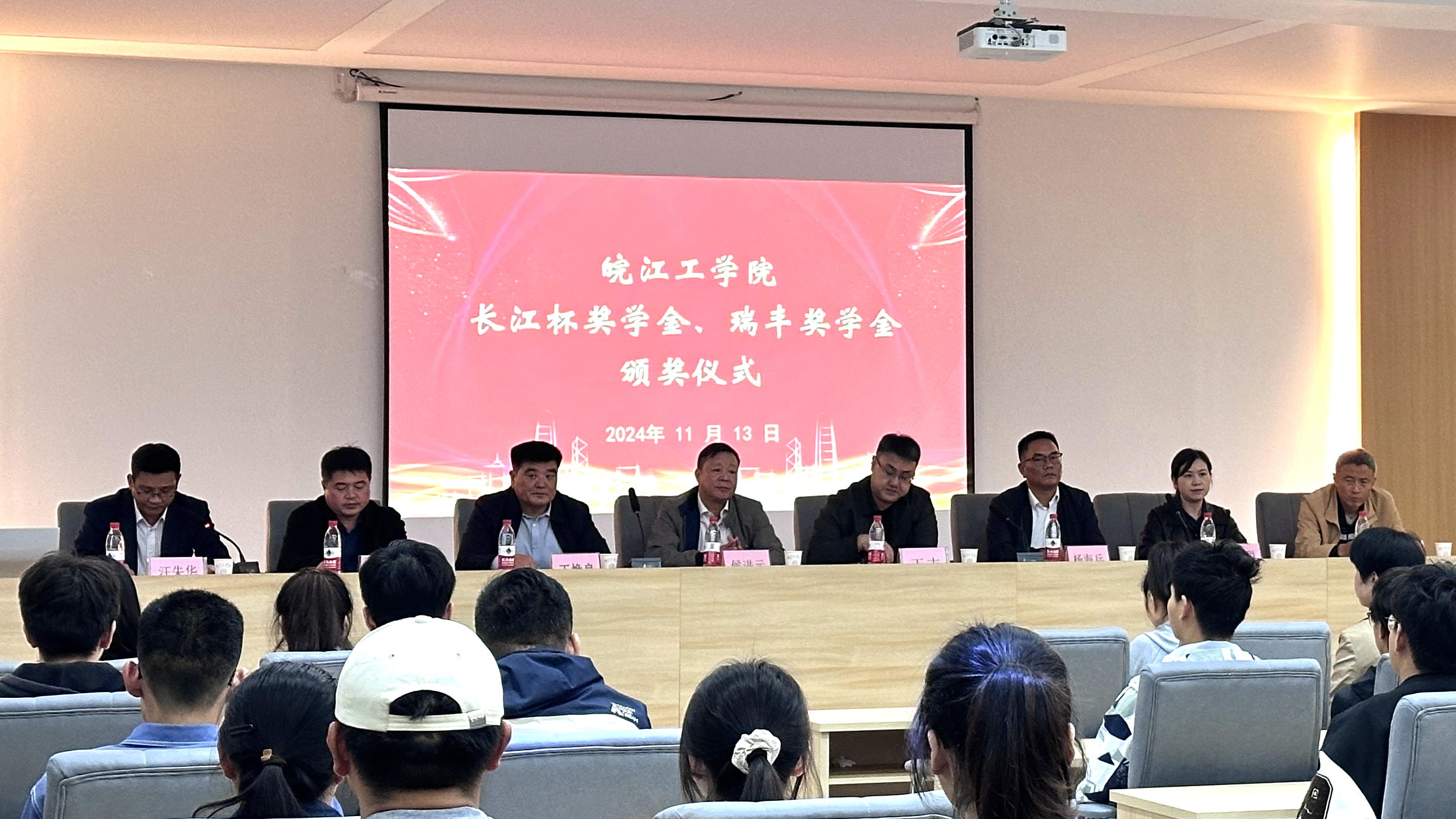 11月13日下午15:30,beat365官网在水木楼楼西301会议室隆重举行了2024-2025学年“长江杯奖学金”和“瑞丰奖学金”颁奖典礼。安徽省长江河道工程有限责任公司董事长杨海兵、人力资源部部长宋小甜和安徽瑞丰工程科技集团有限公司董事长王焕良、副总经理吴玉凯、财务总监孙鲜明,beat365官网副校长侯进元、副校长王志,水利工程学院党总支书记李冠华,学工部常务副部长汪朱华出席此次仪式。颁奖仪式由汪朱华主持。“长江杯奖学金”和“瑞丰奖学金”分别由两家企业出资设立。