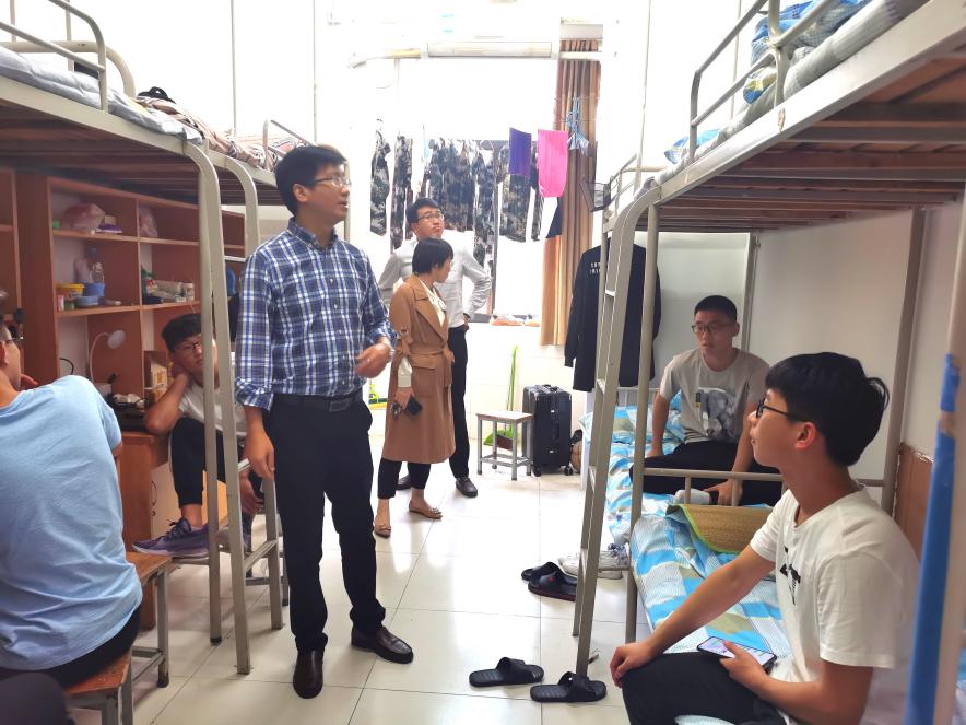 下午16:30,汪朱华副书记以及20级辅导员等一行走访新生宿舍。汪副书记一行每到一个宿舍都详细询问新生有什么困难,希望新生们要尽快适应环境,与同学和谐相处,学会过集体生活,并鼓励大家要以积极的心态完成好接下来的军训。新生们表示,在老师们的关心和鼓励下,他们一定会尽快适应大学生活,努力学好本领,将来更好地报效国家。