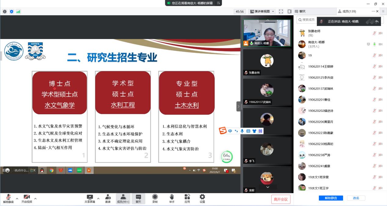 6月7日下午,我院邀请南京信息工程大学水文与水资源学院副院长杨娜教授在线为学生开展了考研辅导讲座,讲座由水利工程学院院长助理张鹏主持。