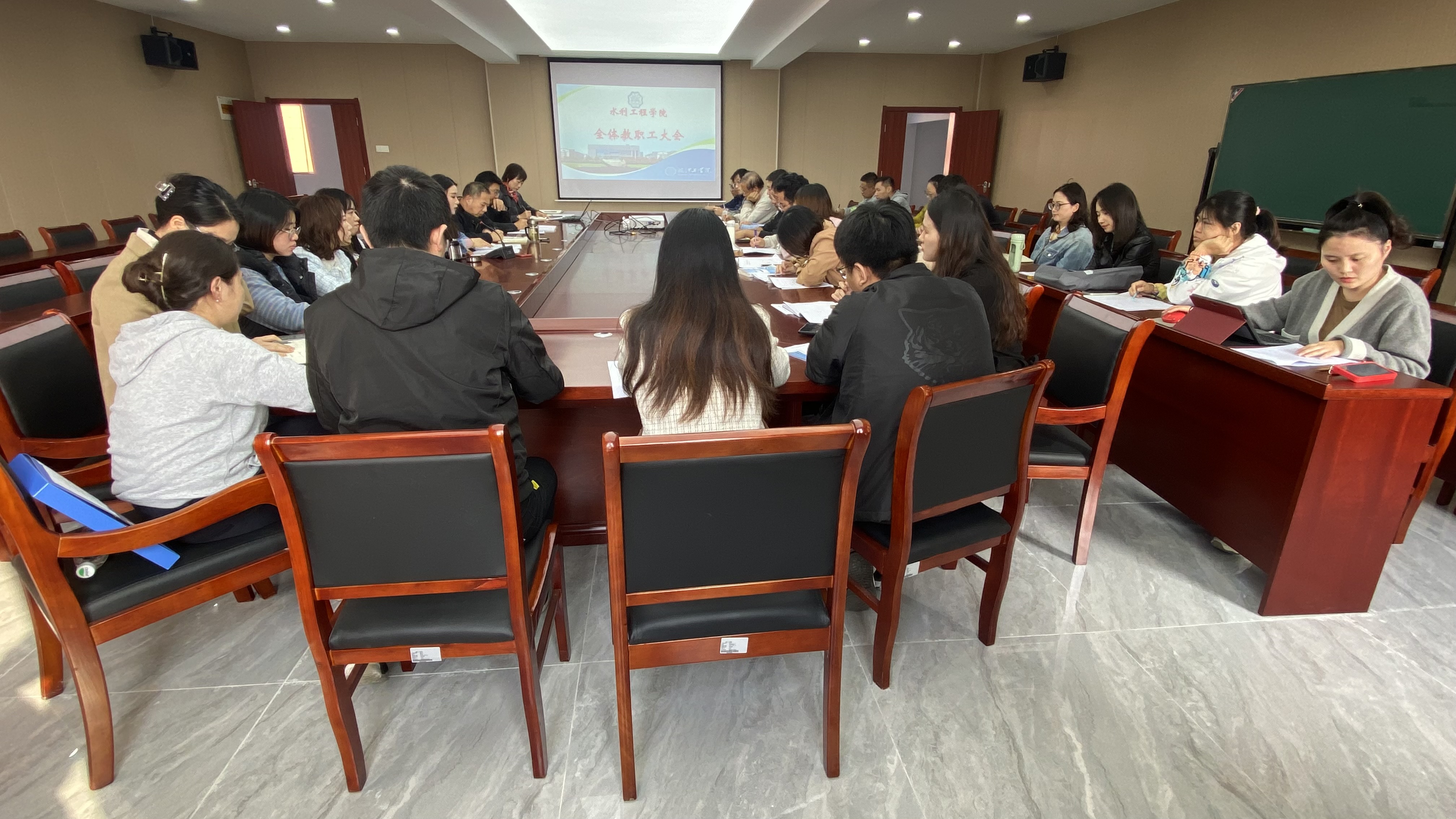 11月9日下午水利工程学院在水利土木楼502会议室召开全体教职工大会,学习贯彻党的二十大精神,布置下一阶段主要工作。张亚梅书记主持会议。