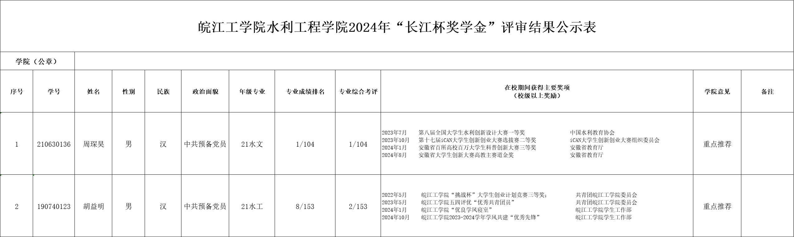 根据皖工学〔2024〕35号《关于做好2024年beat365正版唯一入口必一“长江杯奖学金”、“华孚奖学金”和“瑞丰奖学金”评选工作的通知》文件要求,按照皖工校政〔2022〕266号《beat365正版唯一入口必一“长江杯奖学金”评选办法(试行)》,经学生本人申请、专业综合测评、学院评审推荐,水利工程学院2024年“长江杯奖学金”推荐2人,公示如下: