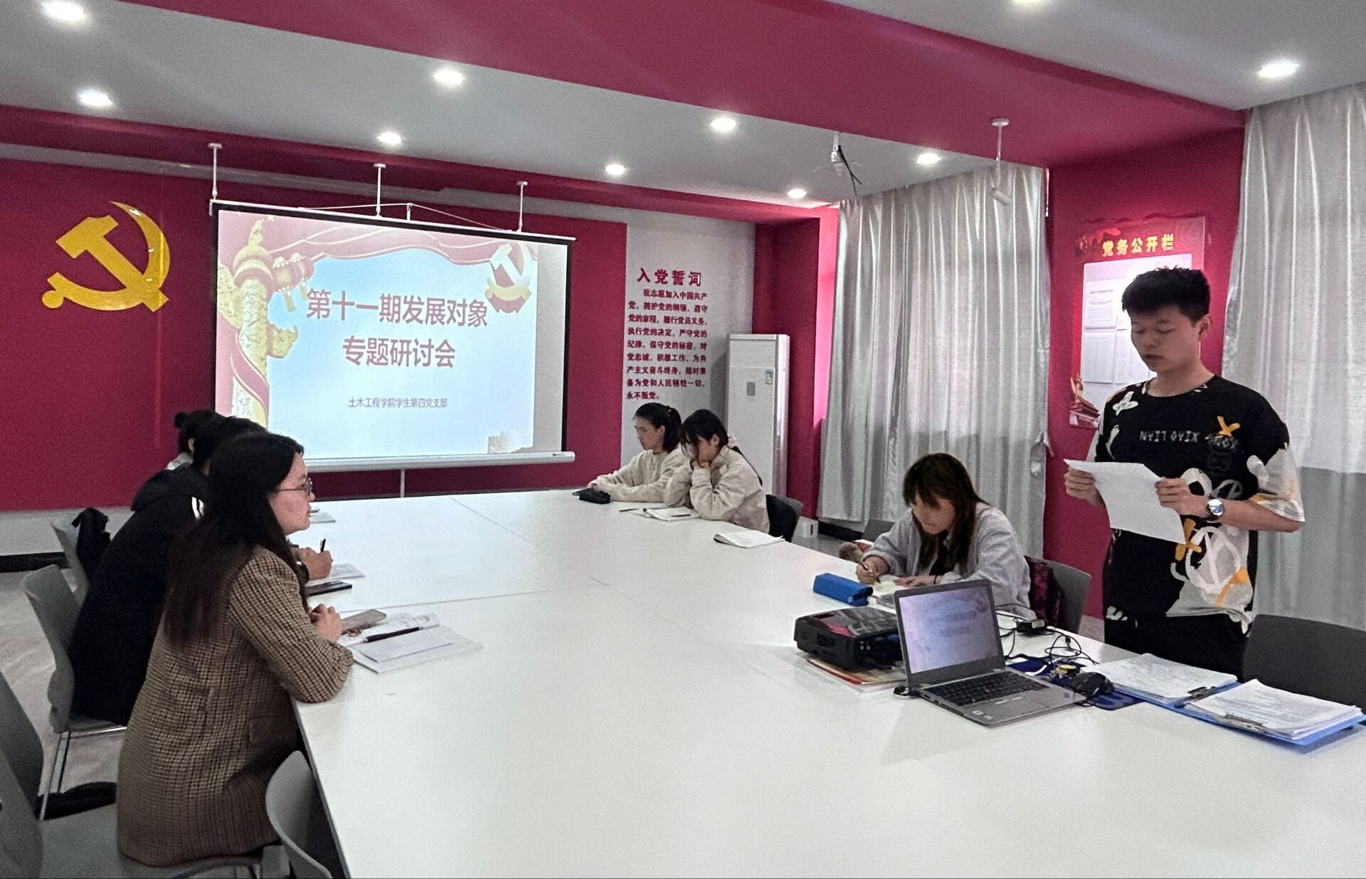 为加强发展对象的党性意识,提高理论素养,引导发展对象坚定不移听党话、跟党走,土木工程学院学生第四党支部于4月11日在党员活动室召开发展对象培训专题研讨会,会议由支部书记王露仪主持,7名发展对象参加会议。