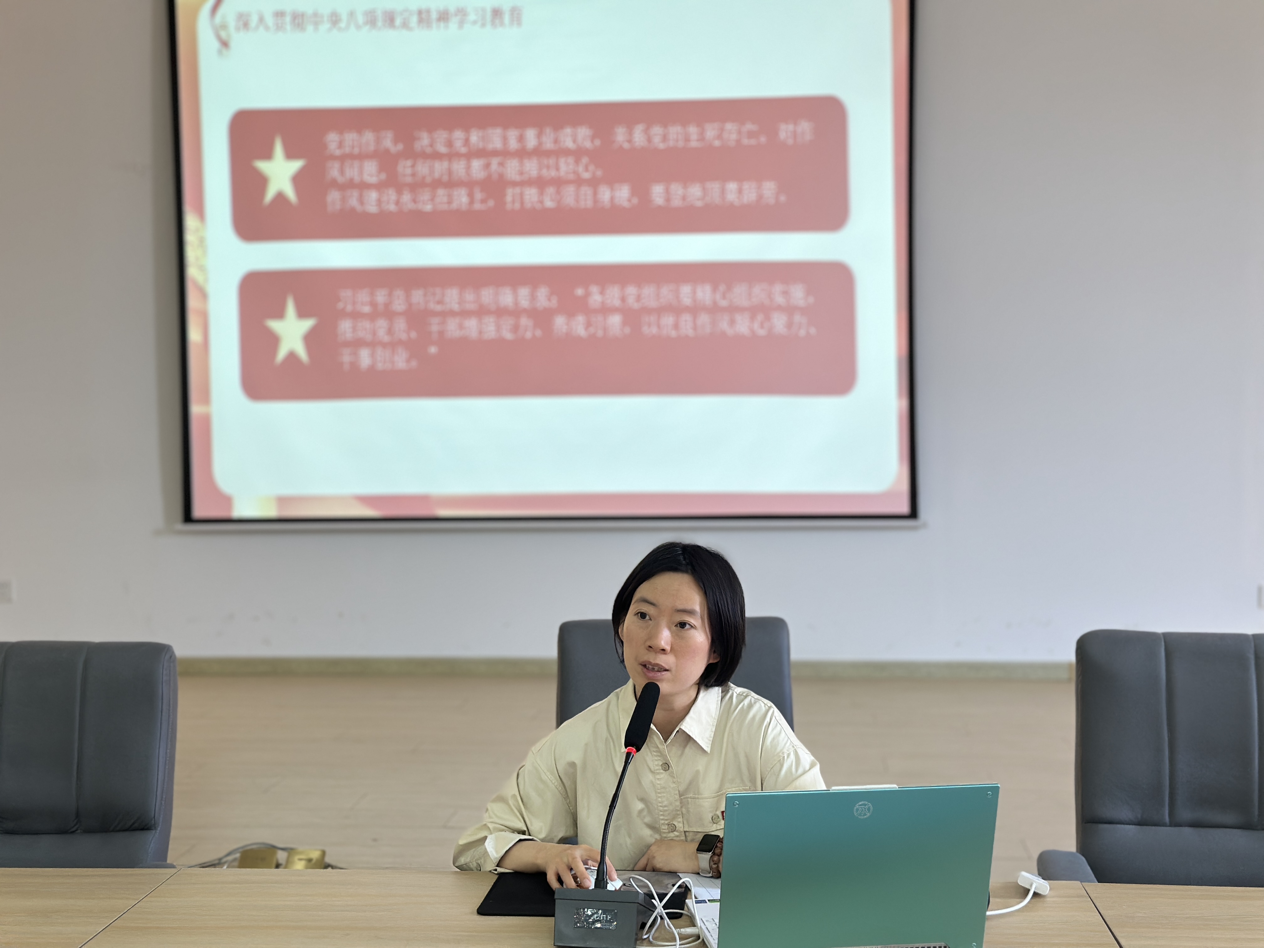 党总支书记王瑜以《徙木立信焕发新活力,干净干事创造新伟业》为主题,结合个人学习体会和学院工作实际,深刻阐释了中央八项规定及其细则在新时代党的政治生活中严明政治纪律、重塑政治生态、取信于民的重要意义,并通过实际案例讲述了自中央八项规定实施以来,党的作风建设取得的显著成效。她要求全体党员要提高政治站位,要充分认识此次学习教育的重要意义,以中央八项规定精神为行动准则,在学习、工作和生活中严于律己,主动发挥党员“双带”作用,以优良党风促校风、带教风、正学风,以担当作为、务实进取的状态为学院高质量发展贡献力量。
