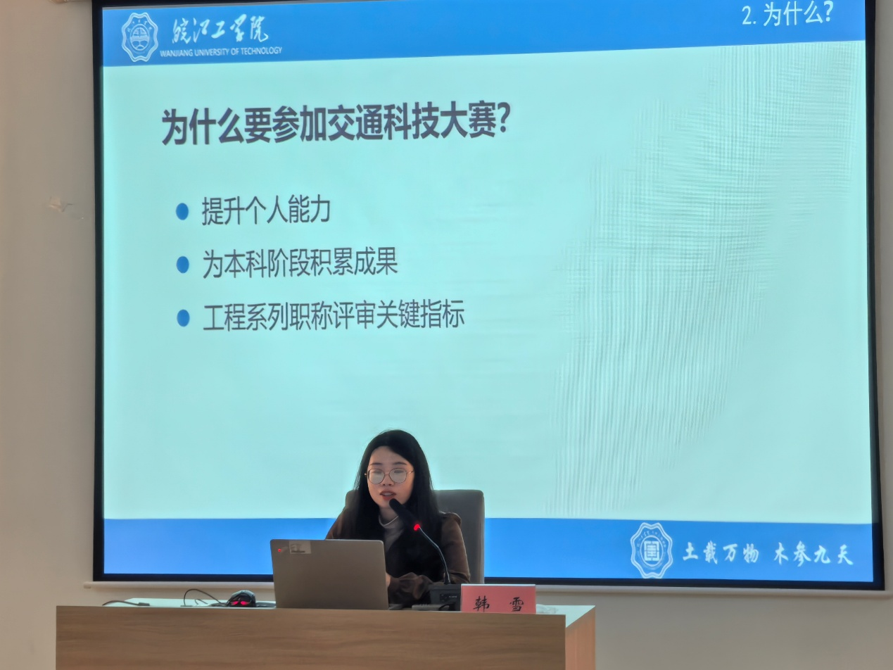 为激发学生科研创新热情,提升学科竞赛参与水平,推动交通工程专业学生实践能力与科研素养协同发展,11月7日,土木工程学院交通工程教研室在水木楼西301报告厅举办“交通科技大赛专题指导讲座”。本次讲座由院长助理韩雪主讲,教研室全体教师、交通工程专业各年级学生以及有意向参赛的同学积极参与。