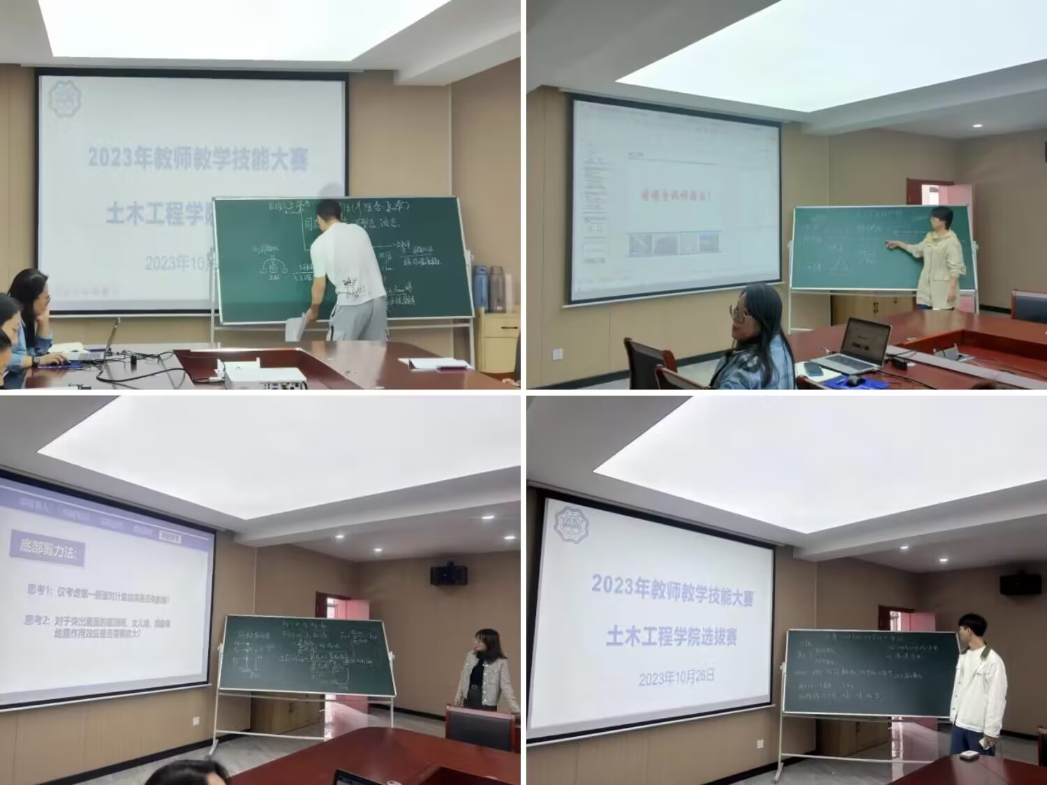 为落实《关于开展2023年教师教学技能大赛的通知》(皖工教〔2023〕12号)文件要求,土木工程学院于10月26日周四上午组织了土木院教师教学技能大赛选拔赛,邀请院长唐德高、院长助理李杰如、各教研室主任作为选拔赛的评委,在西501会议室对各个赛道进行初赛选拔。