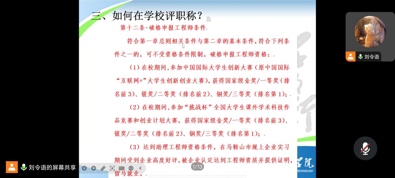接着,师生就“校企联合培养项目对职称评审的助力作用”“双创赛事获奖与职称申报的衔接关系”等展开互动交流。刘令语老师也跟同学们强调了早规划、早积累的重要性,建议同学们建立“理论学习-实践应用-成果转化”的良性循环。