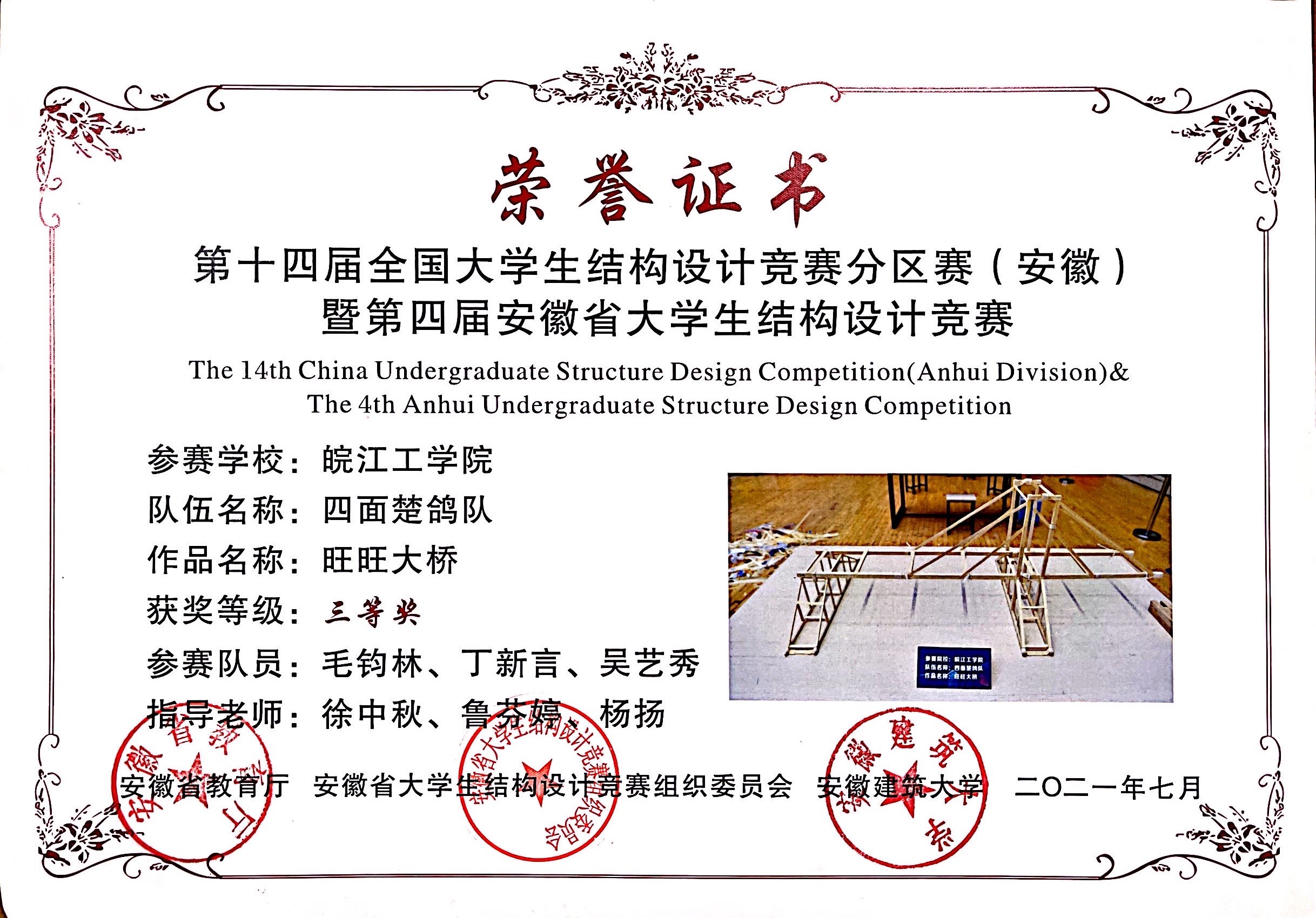 第十四届全国大学生结构设计竞赛分区赛(安徽)暨第四届安徽省大学生结构设计竞赛于今年6月24日至6月27日在安徽建筑大学成功举办。土木工程专业学生朱辉光、仇云龙、阮紫薇完成的作品《喵喵大桥》和毛钧林、丁新言、吴艺秀完成的作品《旺旺大桥》均获得了三等奖。