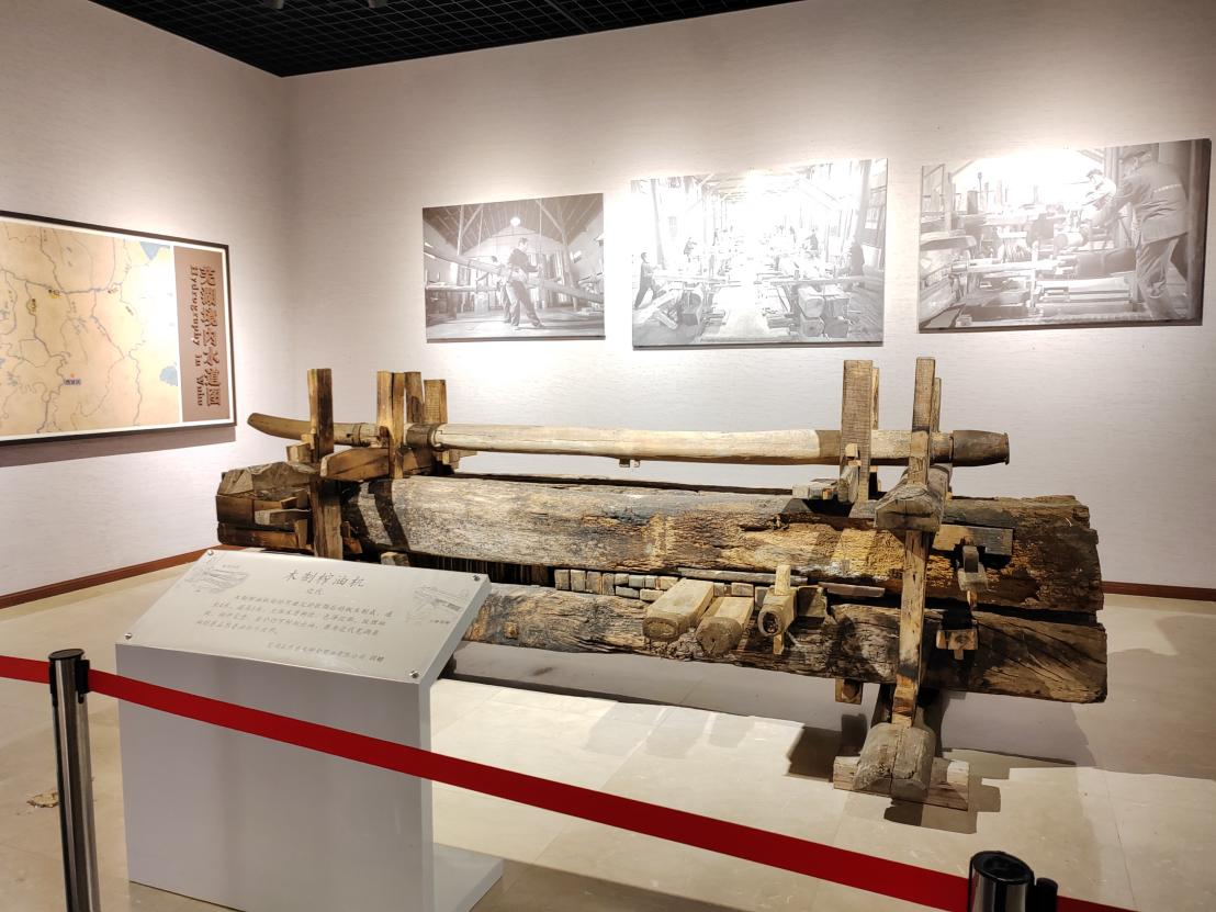 紧接着团队成员参观了木制榨油机,在博物馆陈列的木制榨油机由河塘沉淤脱脂后的枫木制成,通长4米,通高1米,色泽沉郁,构件完整,至今仍可榨制出油。