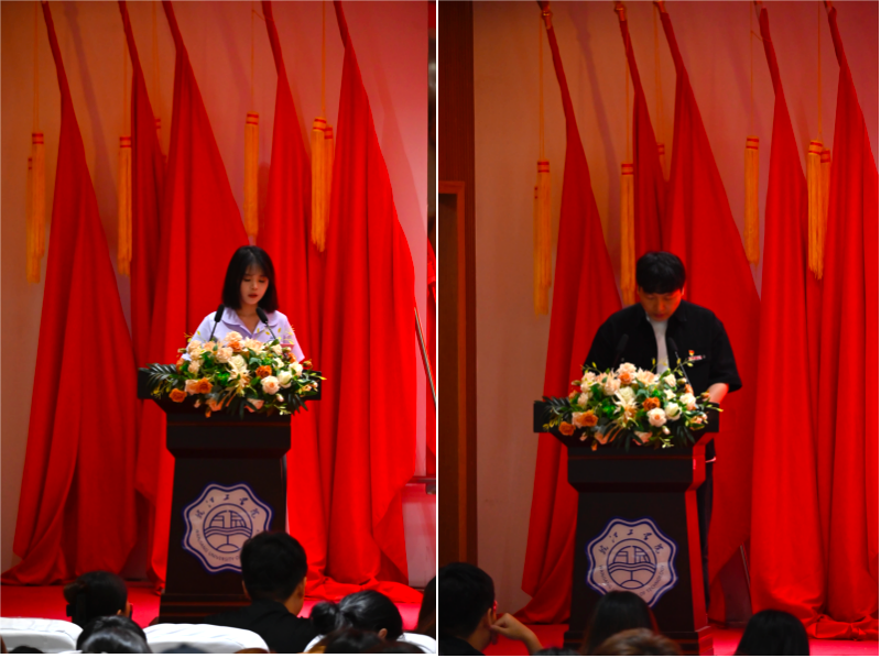毕业生代表叶瑾璨同学发言。她表达了对母校和老师的感激之情,分享了自己在大学期间的成长经历和对未来的展望。曹哲老师作为教师代表发言。他深情寄语毕业生:一是摆正自己位子,保持乐观进取精神;二是不忘与时俱进,树立终身学习理念;三是不忘初心梦想,在奋斗中谱写青春华章。