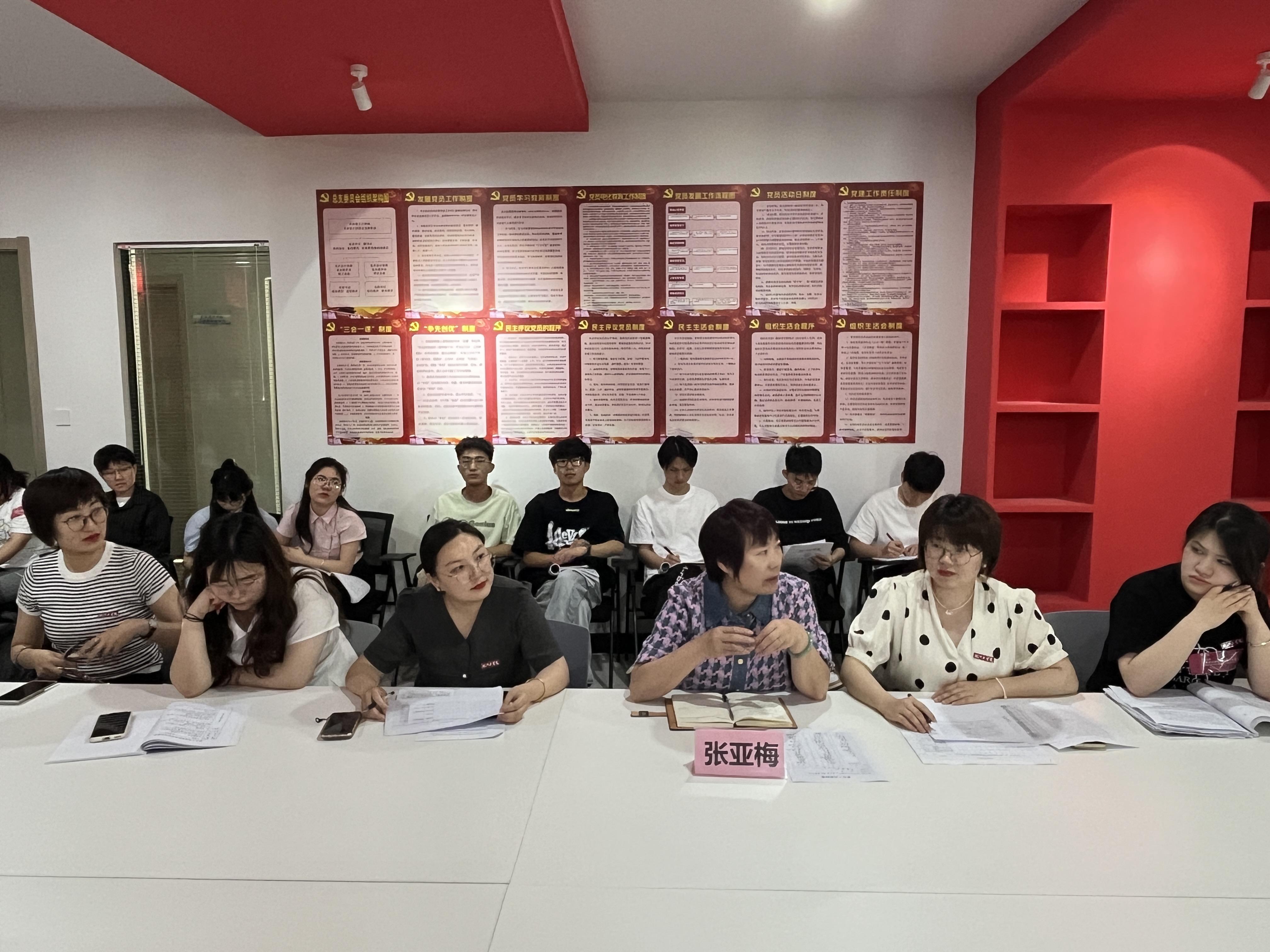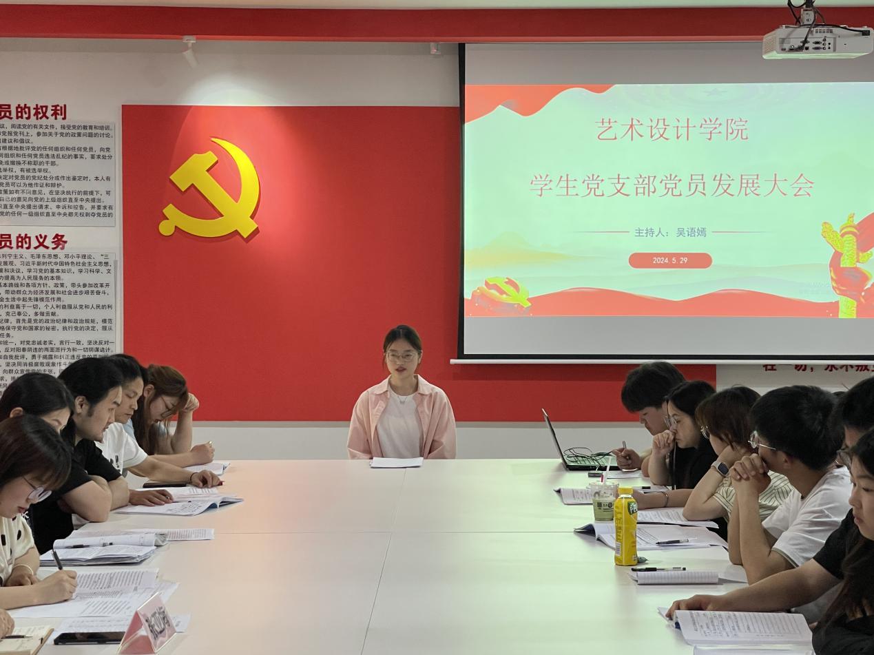 2024年5月29日,艺术设计学院学生党支部在洪雅楼201党员活动室召开学生党支部党员发展大会,讨论了孙芷若等9名同学递交的入党申请书。党总支书记张亚梅莅临会议指导工作,学生党支部全体党员参加会议,会议由学生党支部书记吴语嫣主持。