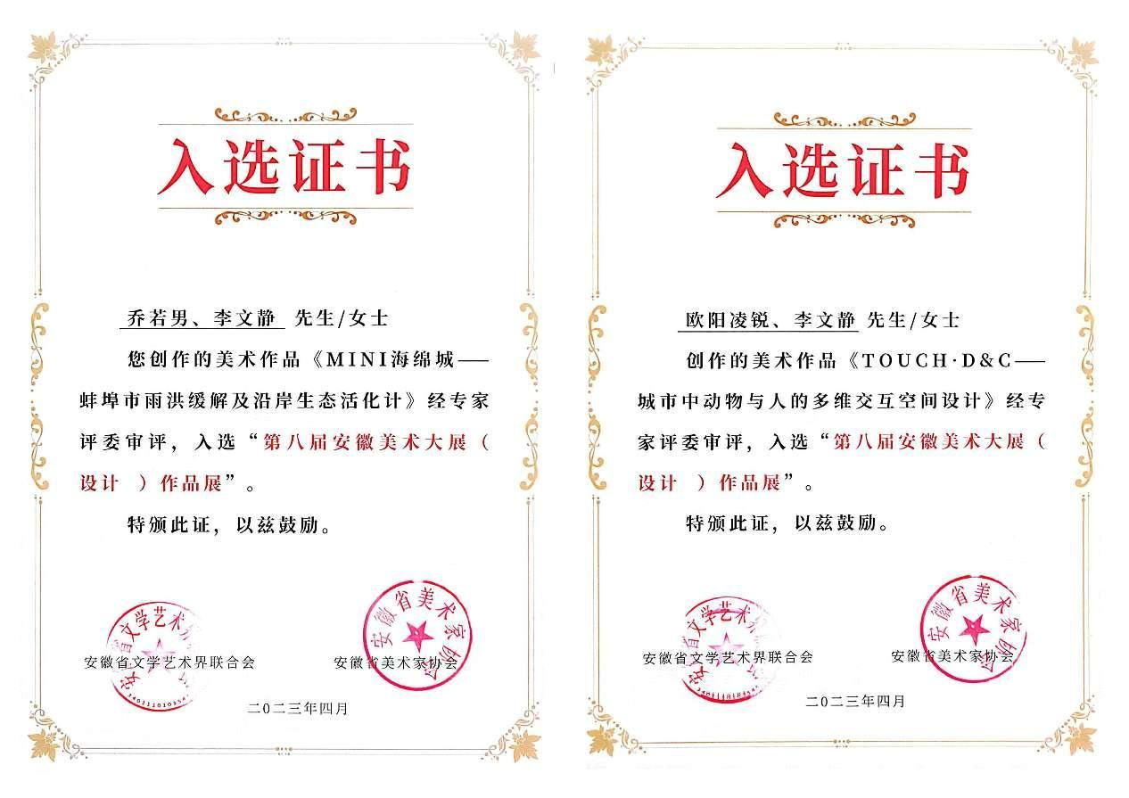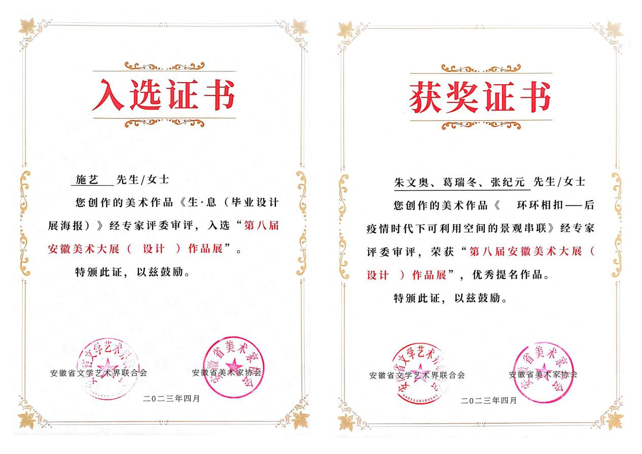 日前,由安徽省文学艺术界联合会、安徽省美术家协会主办,安徽省美术家协会设计艺委会承办的第八届安徽美术大展已完成所有类别的展览活动(设计展分别在芜湖与合肥举办),艺术设计大展共计投稿4264件,经初评、复评,846件作品入选,其中优秀奖提名作品211件。艺术设计学院美育教研室主任施艺的视觉传达作品《生·息》入选,同时由施艺老师指导学生团队完成的环境艺术设计作品3件入选,其中《环环相扣——后疫情时代下可利用空间的景观串联》获得优秀奖题名,这是我院师生首次参加省级综合性艺术大展,并在此次大展中荣获最高奖项。