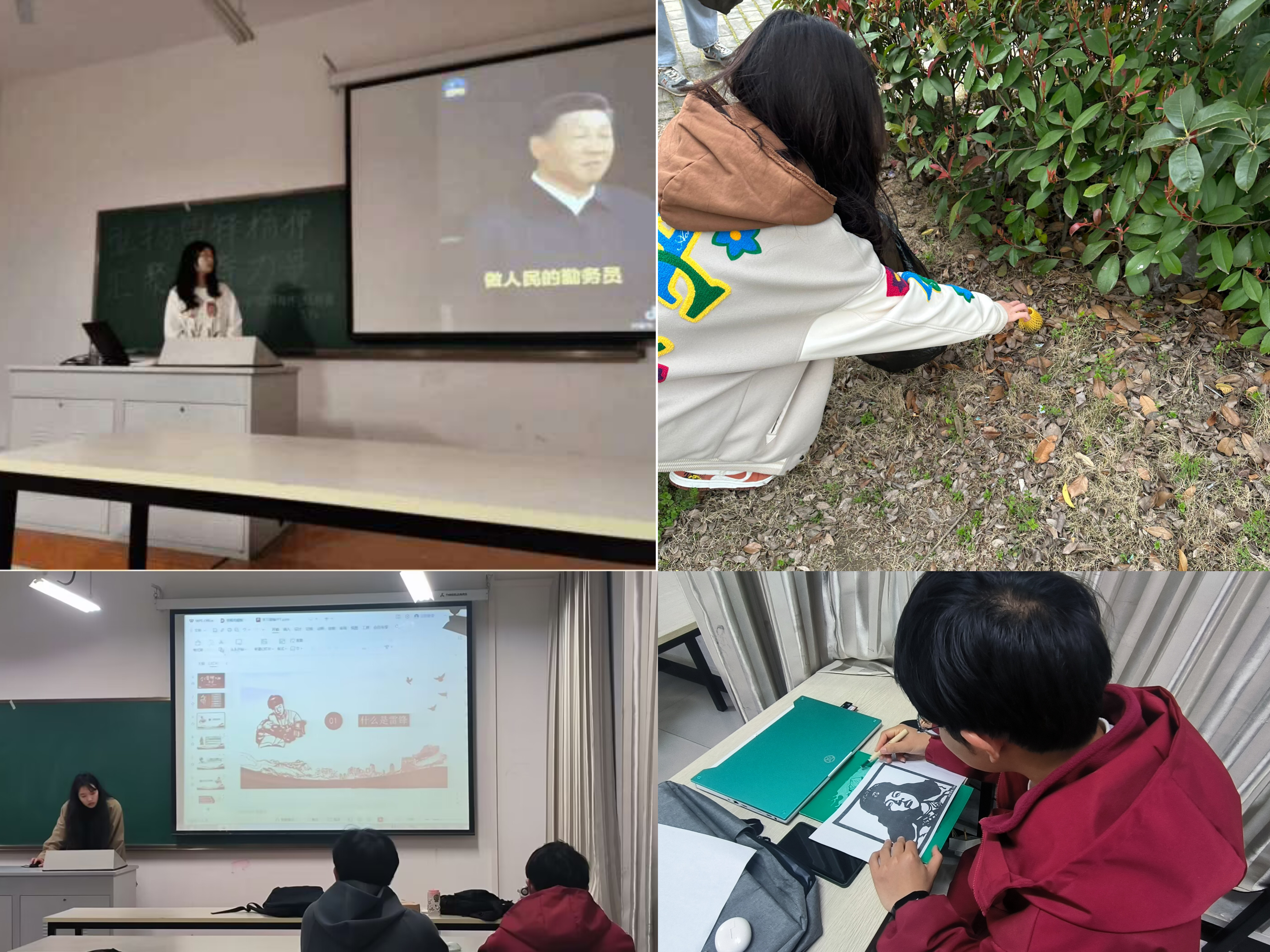 编辑:刘慧 初审:程楠楠 审核:张亚梅 3月13日艺术设计学院召开班团学生干部座谈会,院分团委书记刘慧就“如何开展学雷锋主题团日活动”进行主题分享,在介绍雷锋精神、分享奋进案例的同时鼓励各支部走深落实学雷锋主题团日活动,充分发挥专业特色,积极探索灵活多样、丰富多彩的主题团日活动形式。座谈会后各班级支部纷纷组织主题团日活动,以多样的形式学习雷锋同志的光荣事迹及榜样精神,并使之内化于心,外化于行。同学们利用专业技能在板绘上雕刻出鲜活的雷锋同志形象;组织观看雷锋精神微视频,深入的了解雷锋事迹和雷锋精神的时代价值;自发组织劳动小组拾捡校园垃圾,为美丽校园建设贡献青春力量。