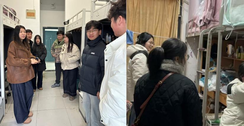 2月16日下午,党总支书记张亚梅、副书记程楠楠带领学工团队分组深入各年级学生宿舍。此行重点是了解学生返校后的适应程度以及学习生活方面的需求,聚焦寝室安全卫生状况。在走访过程中,老师们悉心关注生活细节,对寝室用电安全、卫生环境进行逐一排查,贴心提醒学生做好春季流感防护,并与学生亲切交流寒假期间的见闻以及新学期的个人规划。在走访毕业生宿舍时,张亚梅书记鼓励学生“既要脚踏实地高质量完成最后的学业任务,也要做好充足准备积极就业”。