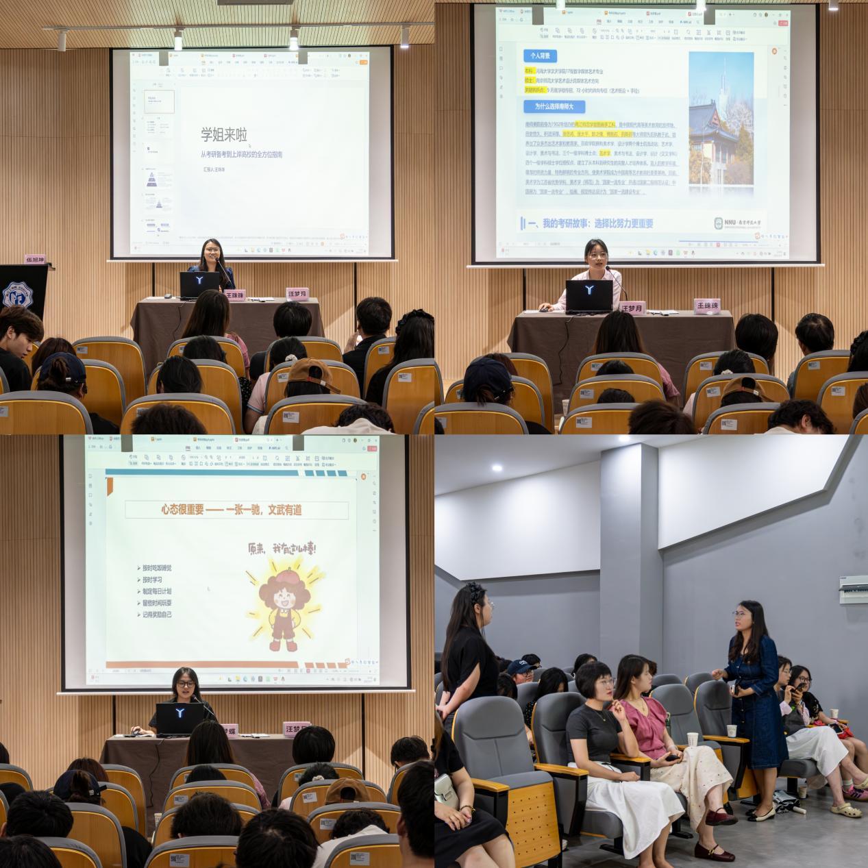 随后,曹哲老师结合自身经历和考研指导的经验,为在座同学提供了清晰的备考路线图。在分享环节,三位优秀校友依次登台,结合跨考或深造的亲身经历,详细讲述了院校选择、复习规划、时间管理、心态调整及复试技巧等方面的经验。她们真实的奋斗历程、实用的备考“干货”以及真挚的鼓励,赢得了现场阵阵掌声。交流环节中,同学们积极向学姐提问,现场气氛活跃,交流充分。