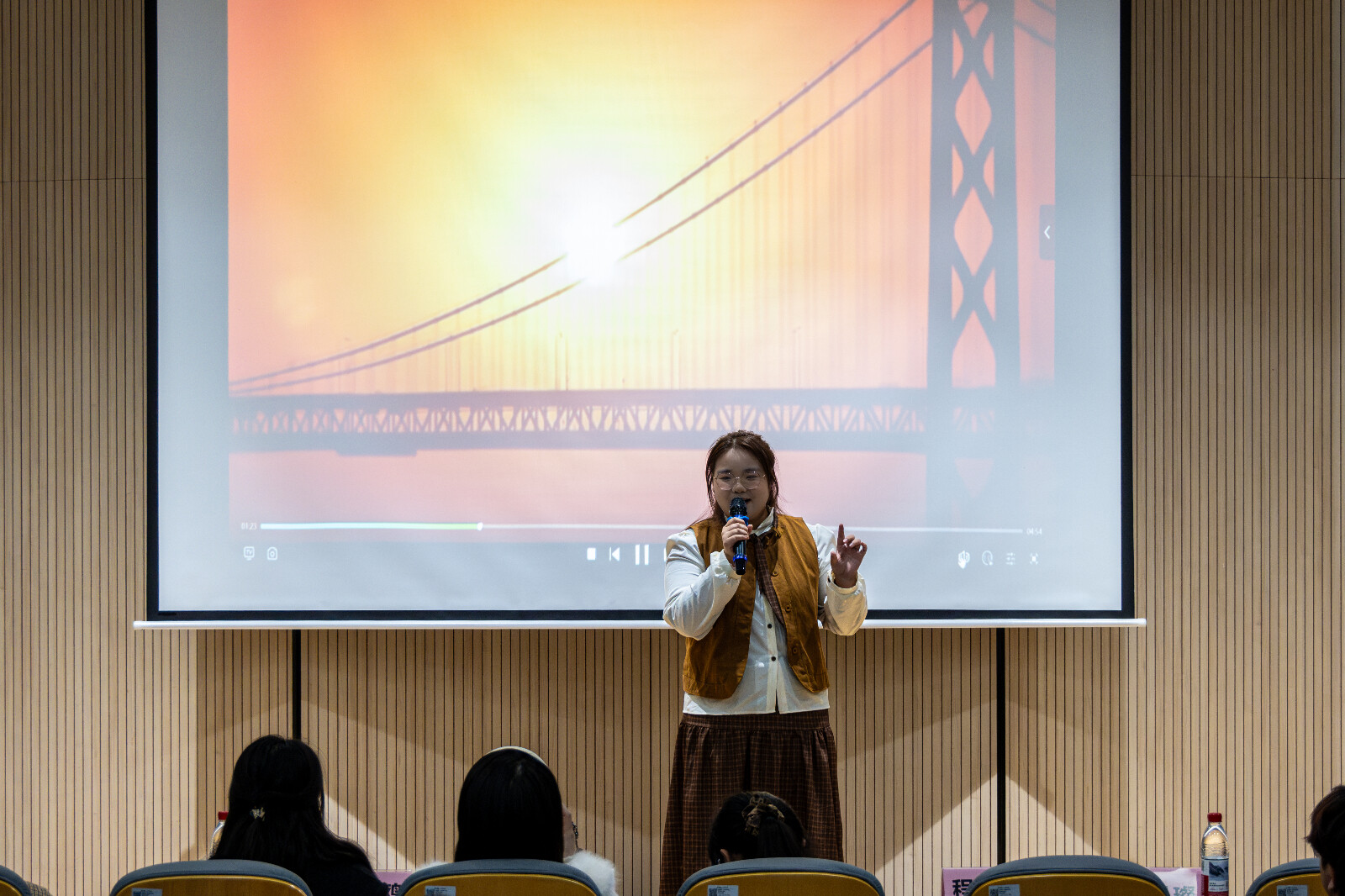 报告厅内气氛庄重而热烈。十五位诵读者依次登台,以饱满的激情诠释了红色经典的时代内涵。他们或慷慨陈词,再现革命先辈的铮铮誓言;或深情诉说,抒发对祖国母亲的赤子情怀。在动人旋律中,朗诵声与音乐交融,将个人理想融入时代主题,展现出青年一代“强国有我”的使命担当,现场氛围热烈,掌声不断。