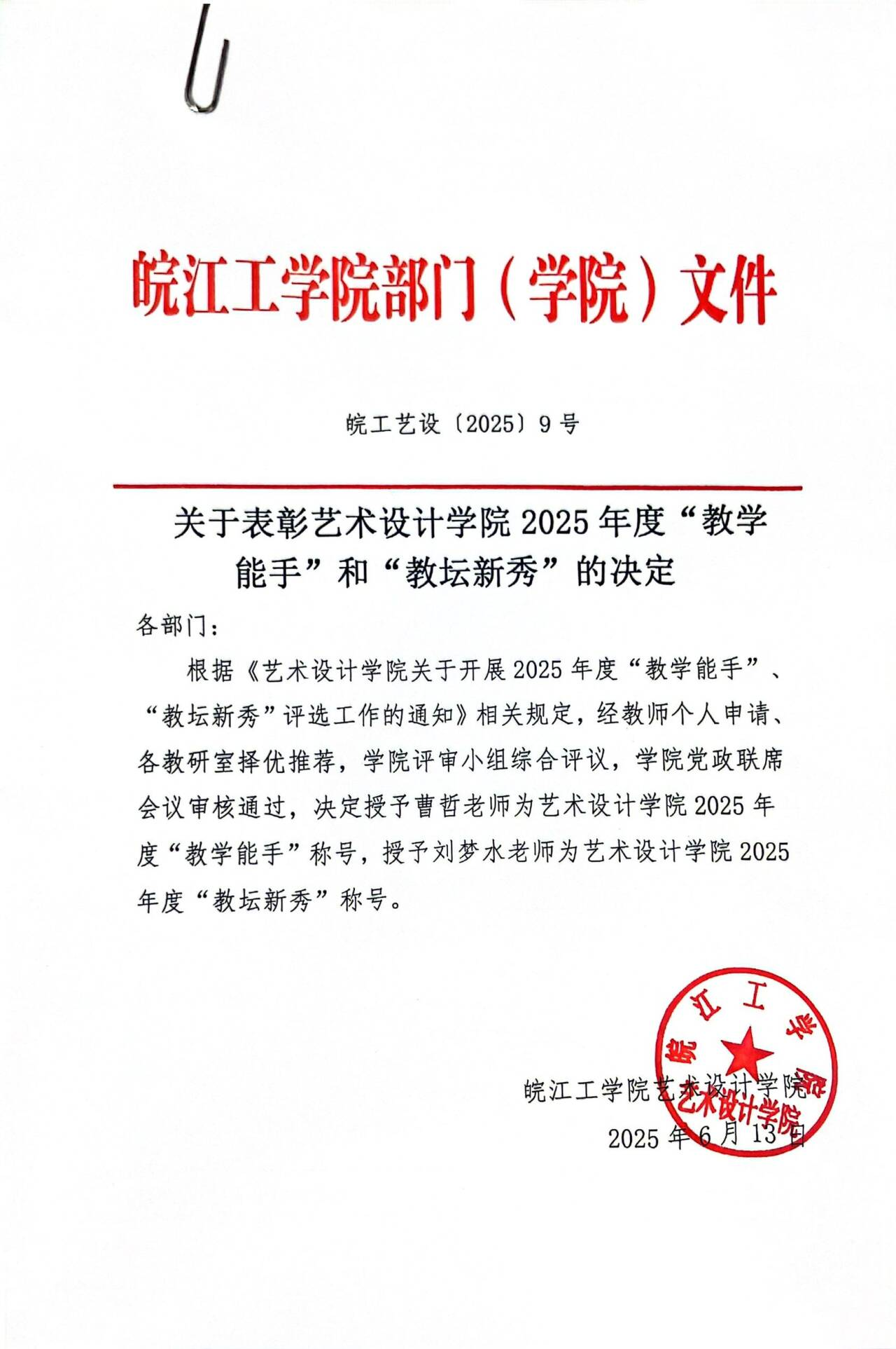 关于表彰艺术设计学院2025年度“教学能手”和“教坛新秀”的决定