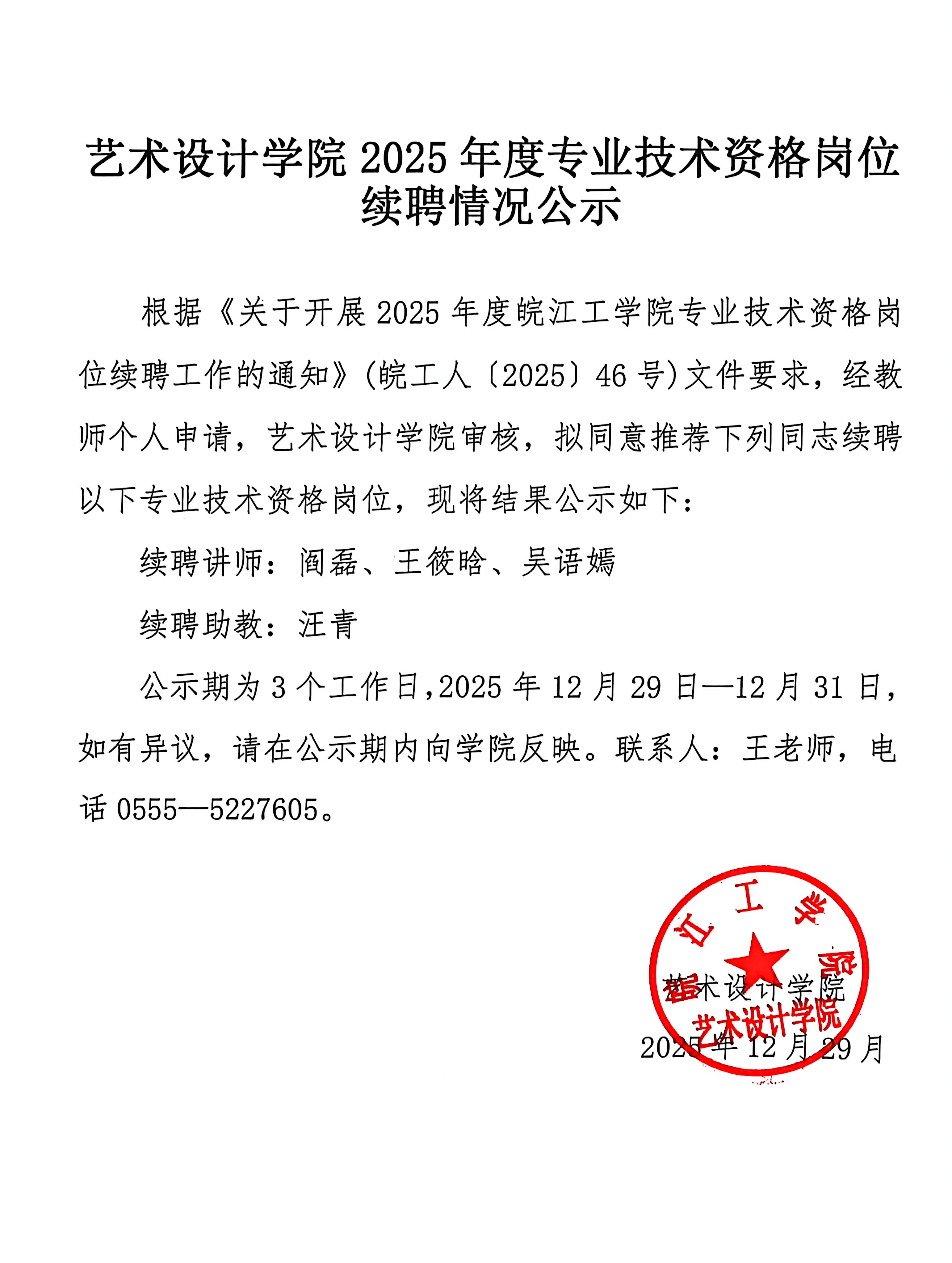 艺术设计学院2025年度专业技术资格岗位续聘情况公示