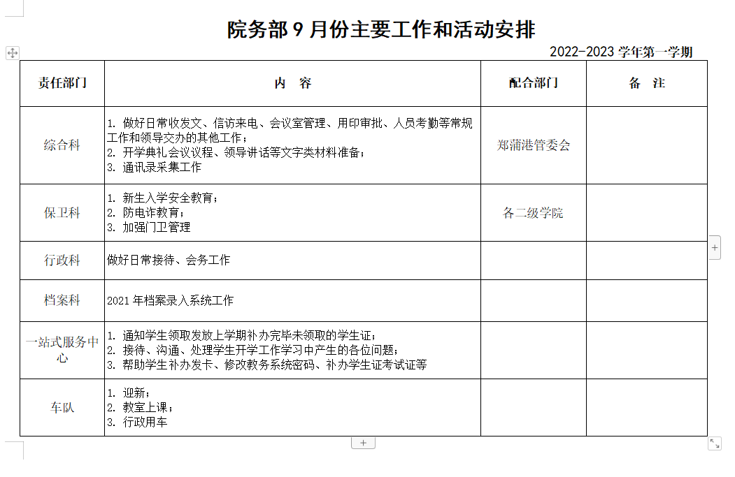 院务部九月份工作安排