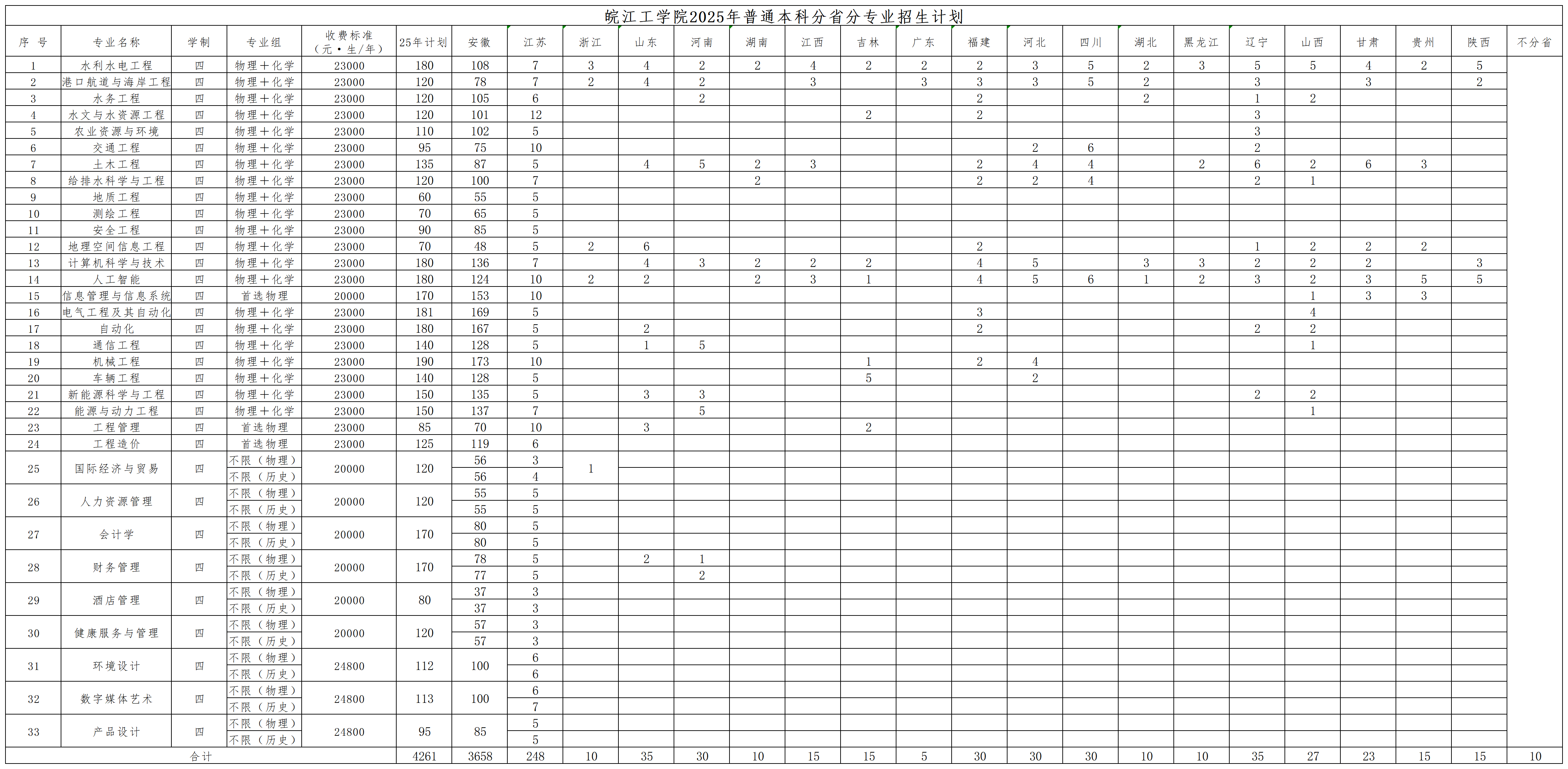 答:beat365官网2025年招生计划4261个,其中安徽省招生计划3658个,外省招生计划593个,不分省招生计划10个。招生专业包括水利水电工程、水文与水资源工程、港口航道与海岸工程、水务工程、农业资源与环境、土木工程、给排水科学与工程、测绘工程、地质工程、交通工程、安全工程、地理空间信息系统、电气工程及其自动化、通信工程、自动化、计算机科学与技术、人工智能、机械工程、车辆工程、能源与动力工程、新能源科学与工程、国际经济与贸易、会计学、财务管理、信息管理与信息系统、工程管理、工程造价、人力资源管理、健康服务与管理、酒店管理、环境设计、数字媒体艺术、产品设计在内的33个。