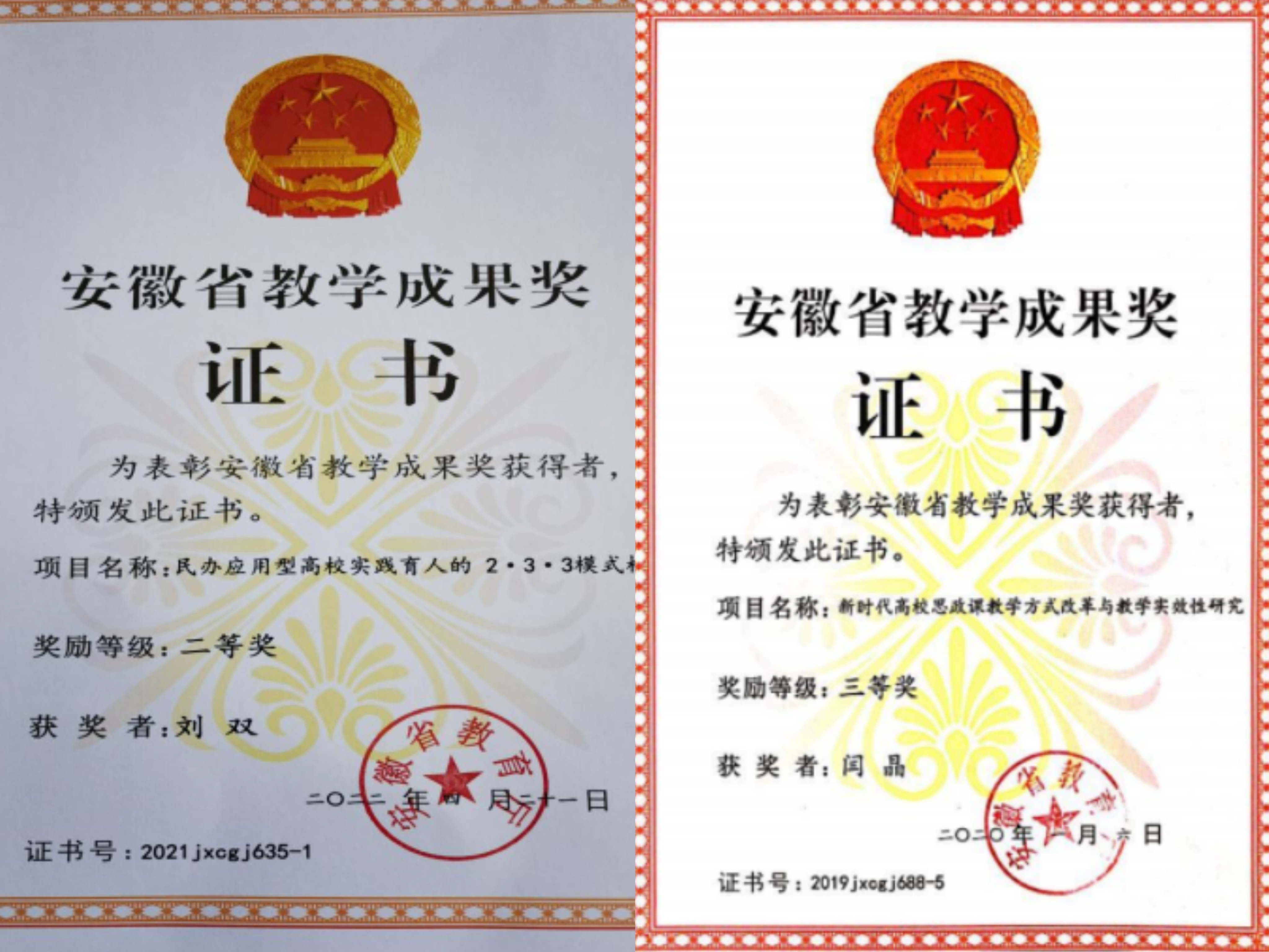 建校以来,学院教师获得安徽省优秀教师1名,安徽省思政课教学大赛一等奖1名,二等奖3名,三等奖3名。安徽省教学创新大赛三等奖1名,长三角教学竞赛三等奖1名,获批安徽省优秀党员2名。获得安徽省教学成果奖二等奖2项,三等奖2项。校级教学成果奖二等奖2项,安徽省思政课示范金课入围奖1项。