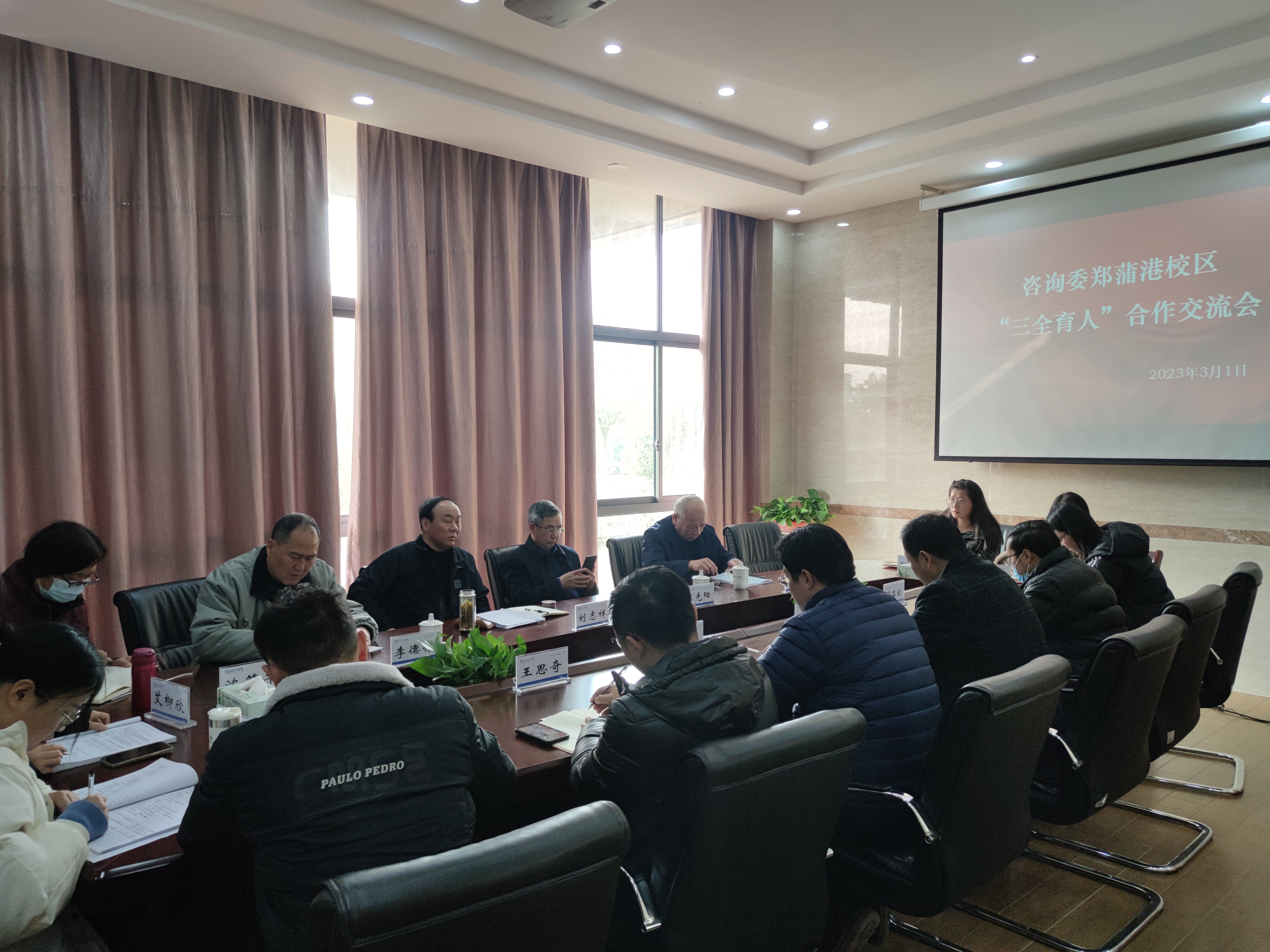 3月1日下午,beat365官网咨询委员主任刘志祥,咨询委副主任马建、汪光阳,咨询委秘书长李德俊,院务部部长沈筱华一行深入郑蒲港校区调研,就“三全育人”专项课题,与郑蒲港校区管委会相关人员进行课题研究合作的座谈与交流,郑蒲港校区管委会主任汪斌、校区管委会主任助理陈波、相关部门负责人、辅导员代表参会。会议由刘志祥主任主持。