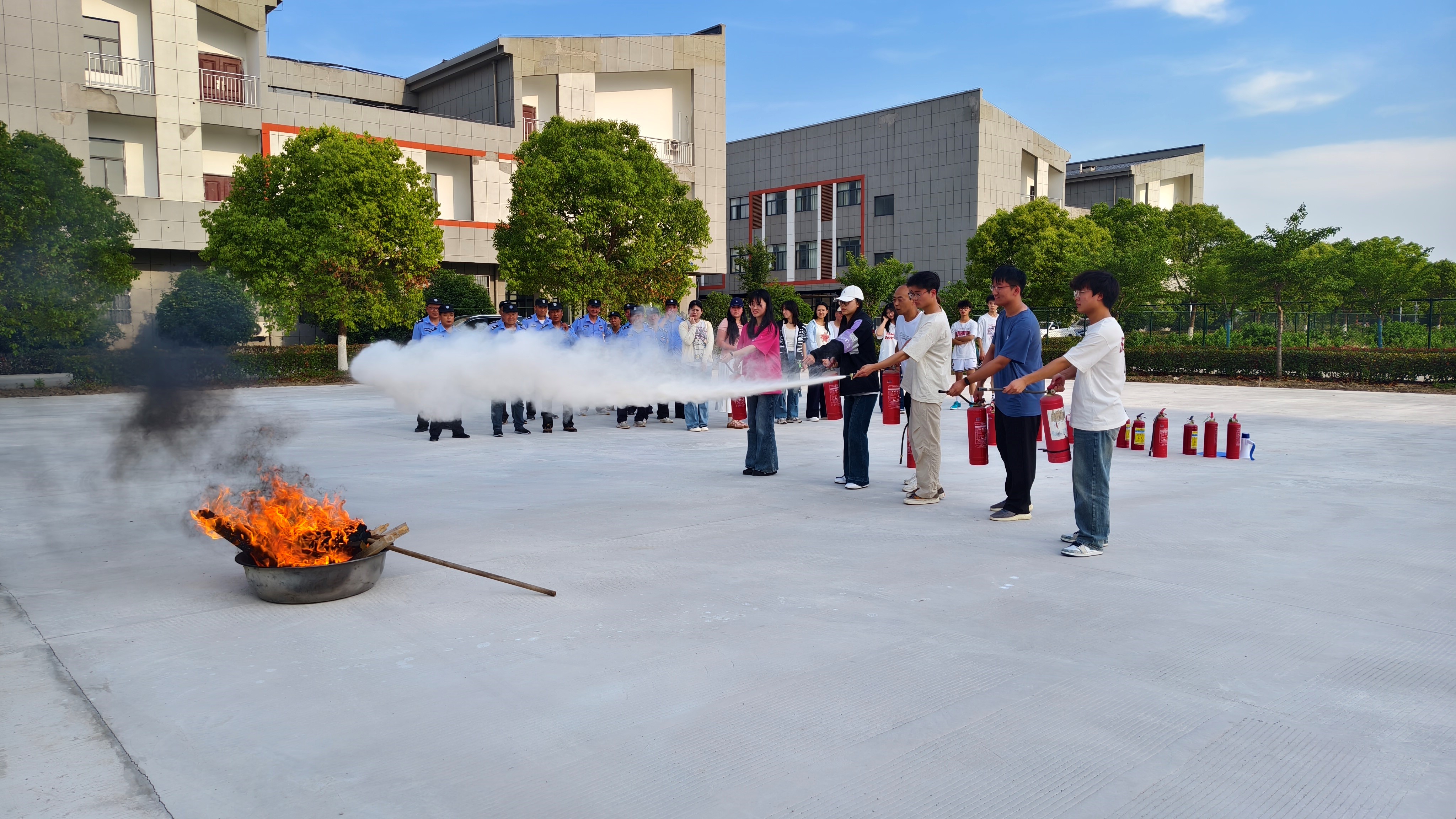 疏散环节结束后,各班级学生安全员与灭火行动组一同前往校区消防楼广场开展了灭火实战培训。保卫科吴小君详细讲解了校园常见火灾类型及初期火灾的处置方法,并结合干粉灭火器的使用进行了实战演练。