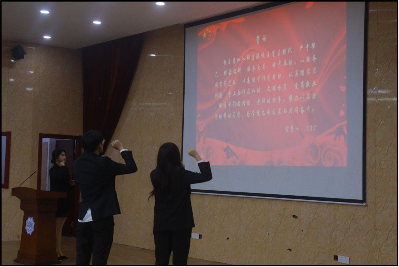 紧接着,郑蒲港校区第八届学生会主席万光政、学生社团联合会主席颜雅钰两位主席分别对上一期工作进行工作汇报。总结了上一学年各部门所取得的优秀成果,为上一学年的各项工作画上圆满句号。随后,老师们为各部门成员颁发聘书并合影留念,领取聘书时,各部门成员精神焕发,斗志昂扬,让我们不由得想到了校区分团委和学生社团联合会的光明前景。王雨晴老师先是宣读了第九届学生组织干部选定办法和任命结果,最后为郑蒲港校区第九届校区分团委及社团联合会主席授予公章。紧随其后在郑蒲港校区第九届校区分团委及社团联合会主席的带领下进行庄严宣誓,一声声庄严而坚决的誓言表明了各位新上任干部积极向上的决心。